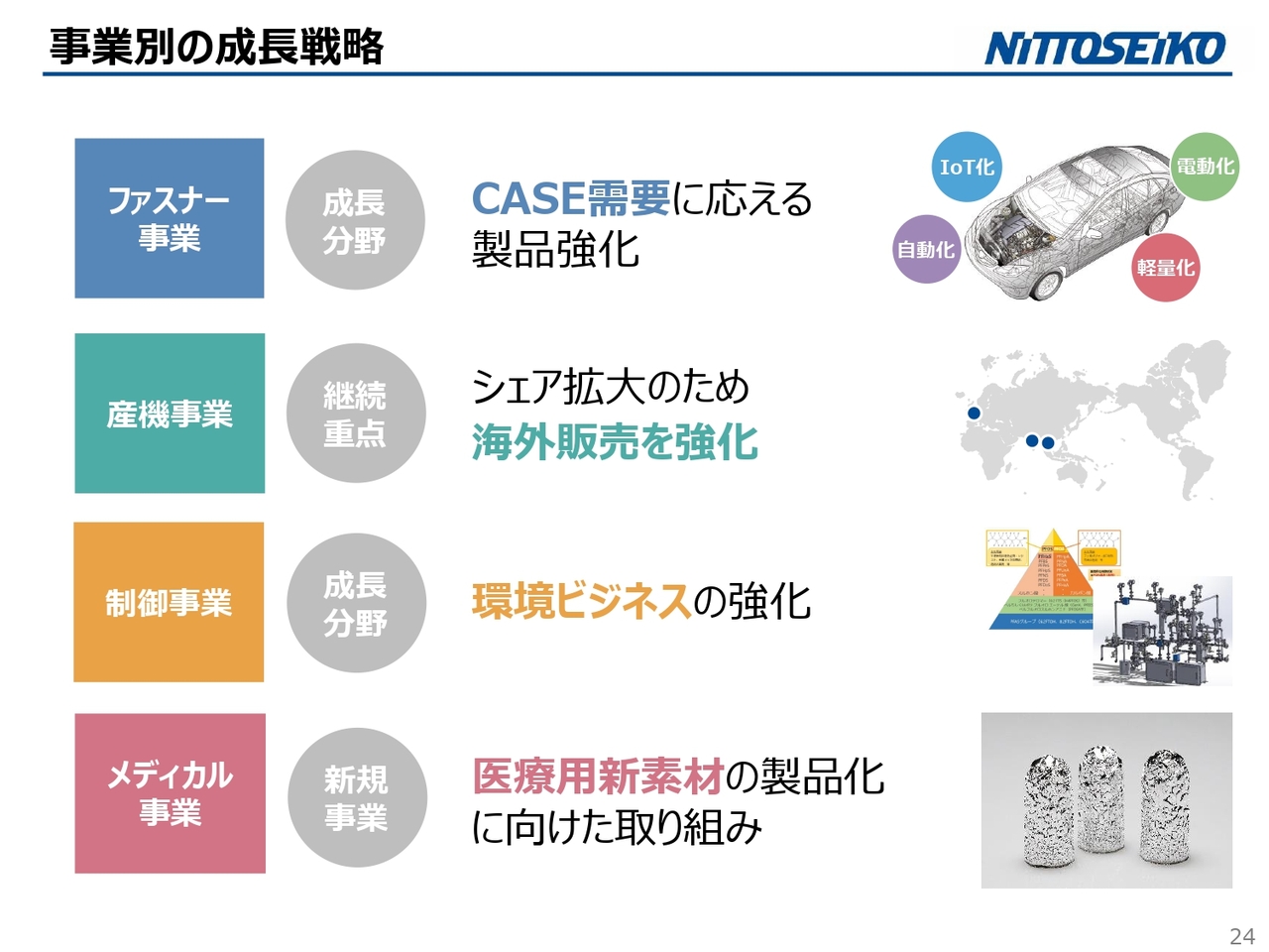 当社としては、単純な規格品やホームセンター向けのねじは販売していないとお伝えしましたが、高付加価値品や高機能品、そして当社の特許製品を中心にビジネス展開を進めていきたいと考えています。特に、電子化、自動化、高性能化が求められる分野においては成長機会が非常に大きいと見ています。