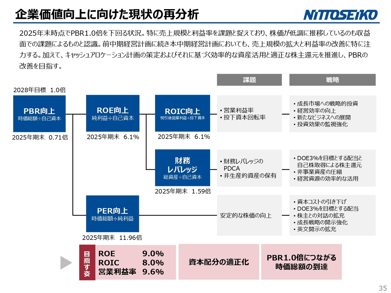 前中期経営計画に続き、本中期経営計画においても売上規模の拡大と利益率の改善に注力していきます。さらに、キャッシュアロケーション計画の策定と、それに基づく効率的な資産活用および適正な株主還元を推進し、PBRの改善を目指していきます。