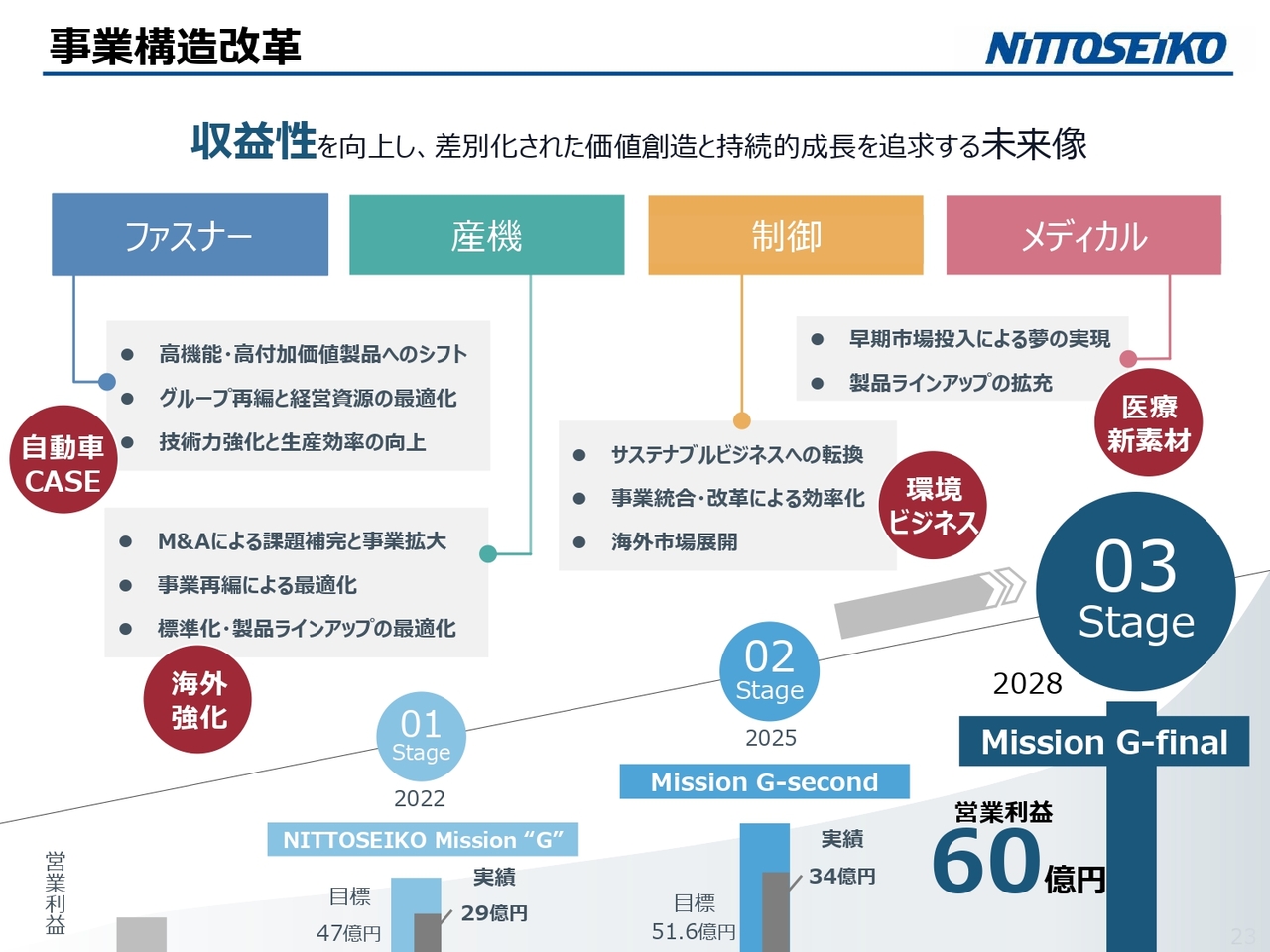 荒賀:事業構造改革においては、ファスナー事業、産機事業、制御事業、メディカル事業でスライドに記載の内容で進めていき、収益性の向上を図っていこうと考えています。