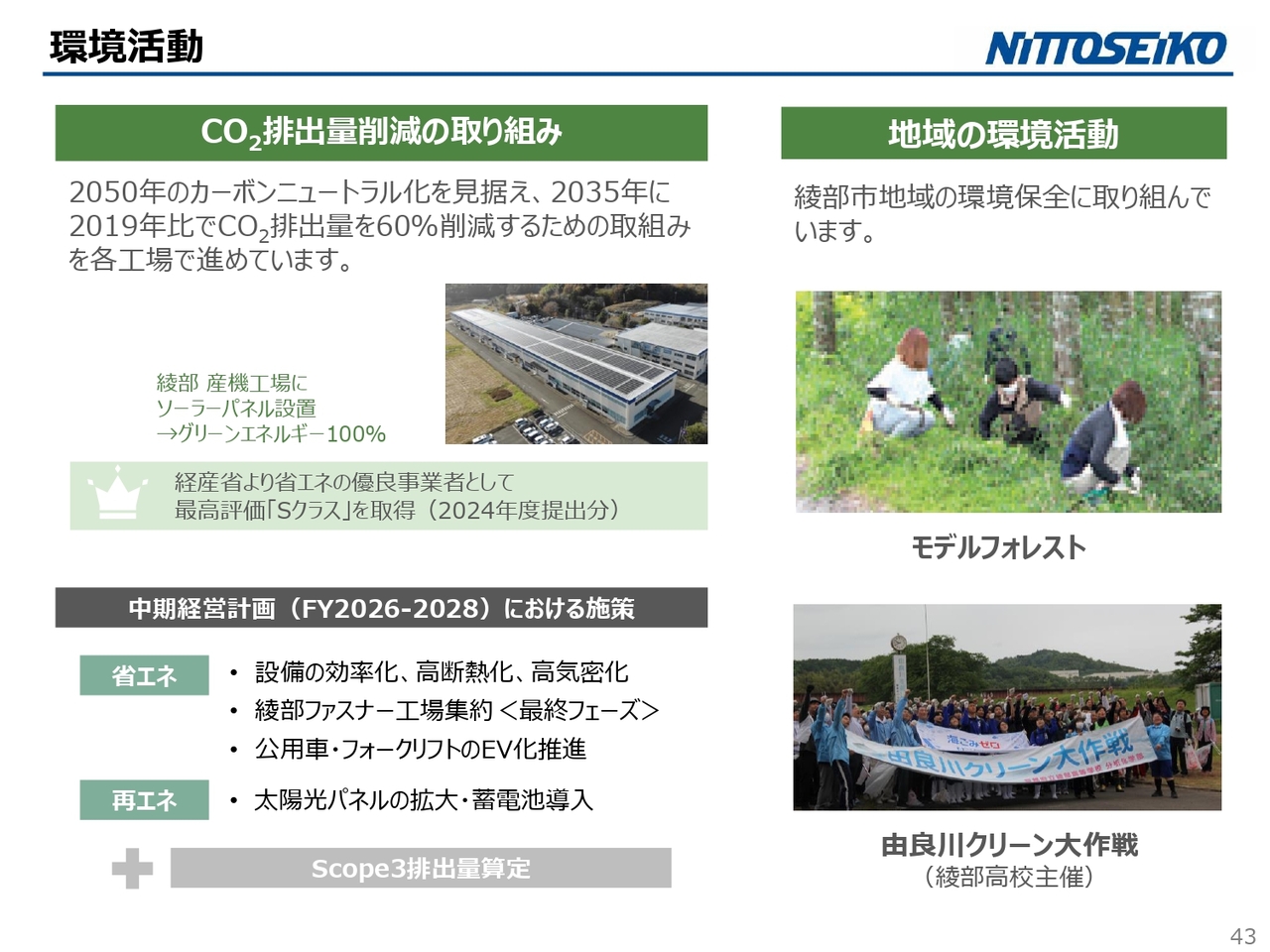 荒賀:環境活動に重点を置いています。先ほどお伝えした中期経営計画の中でも取り組んでいます。また、地域の環境活動も行っており、従業員もボランティアとしてさまざまな地域活動を実践しています。