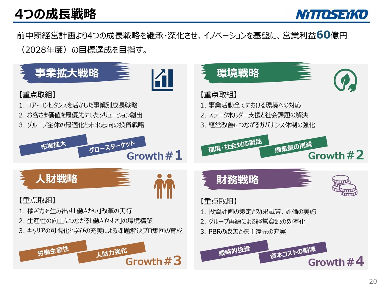 荒賀:成長戦略は、「事業拡大戦略」「環境戦略」「人財戦略」「財務戦略」の4つです。詳細については後ほどご説明します。