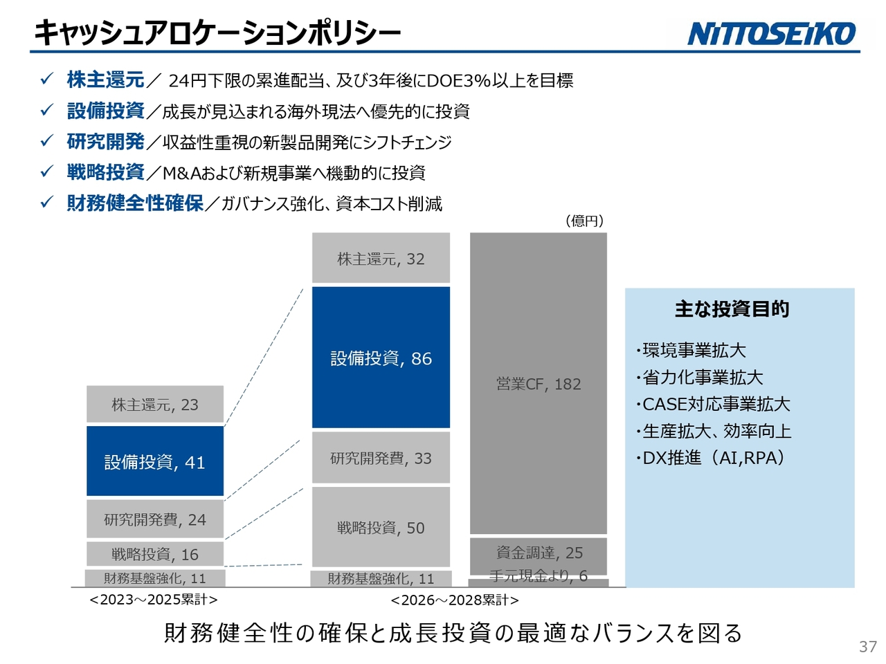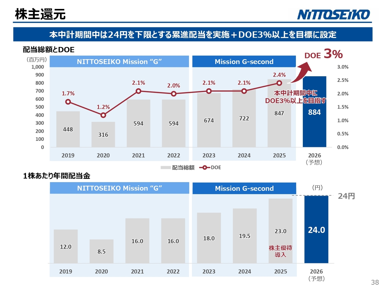 また、本中期経営計画期間中は、1株あたり24円を下限とする累進配当を実施し、DOE3パーセント以上にすることを目標とし、キャッシュを成長投資と株主還元に適切に配分していきます。