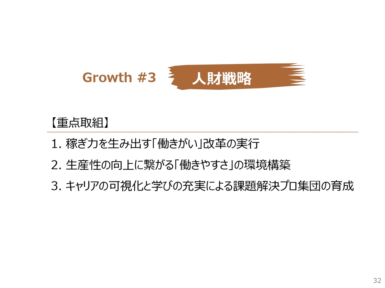 荒賀:Growth#3の人財戦略としては、スライドに記載の3つの重点取組を進めていきたいと考えています。