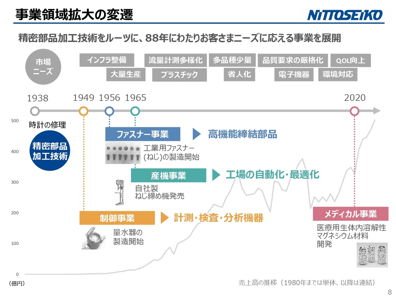 そこで培った精密加工技術を活かして事業を拡大し、高度経済成長期にはインフラ整備や大量生産に対応しました。その後、多品種少量生産や省人化への取り組みを経て、近年では電子機器や環境対応といった分野への展開を進めてきました。