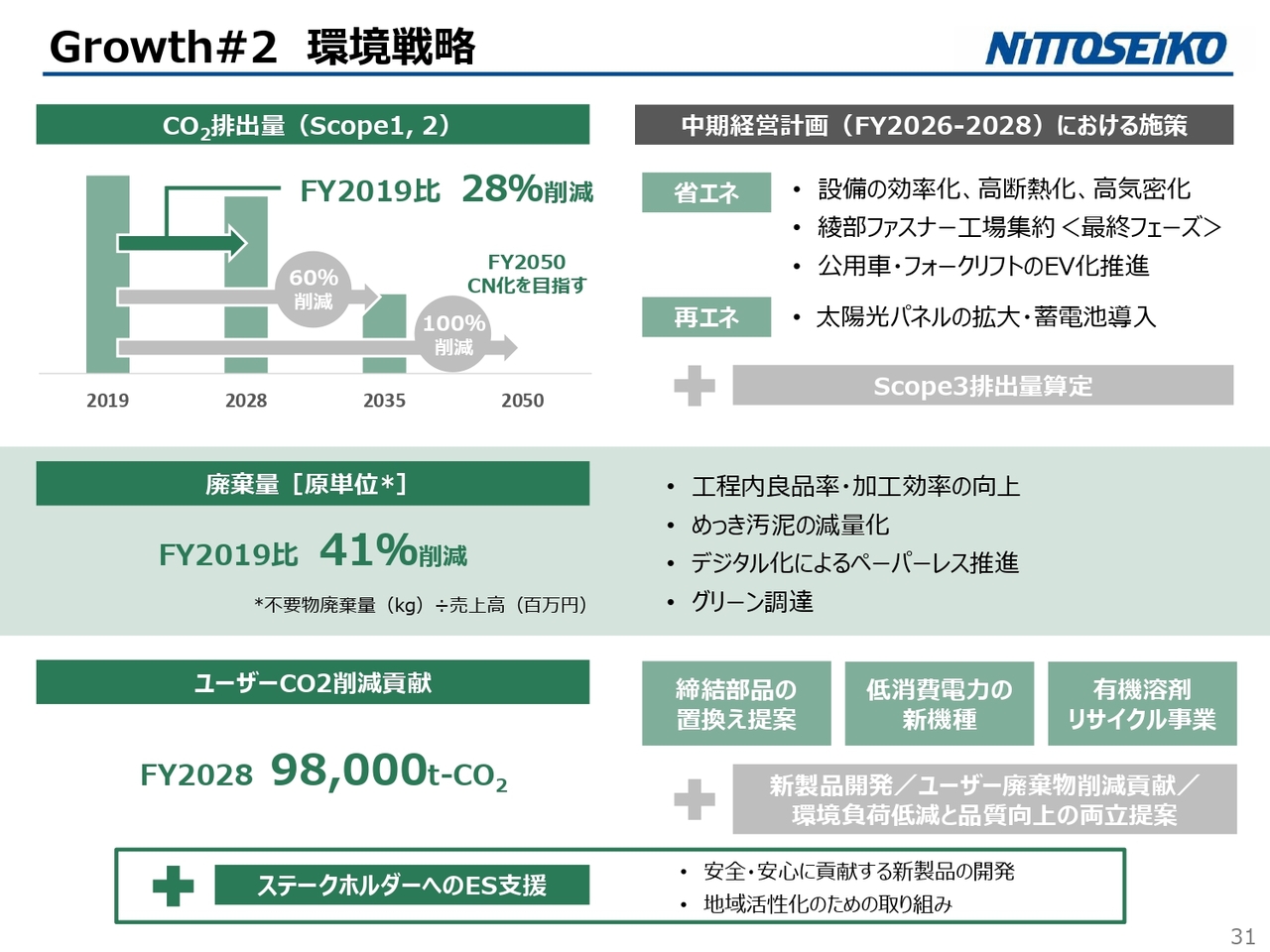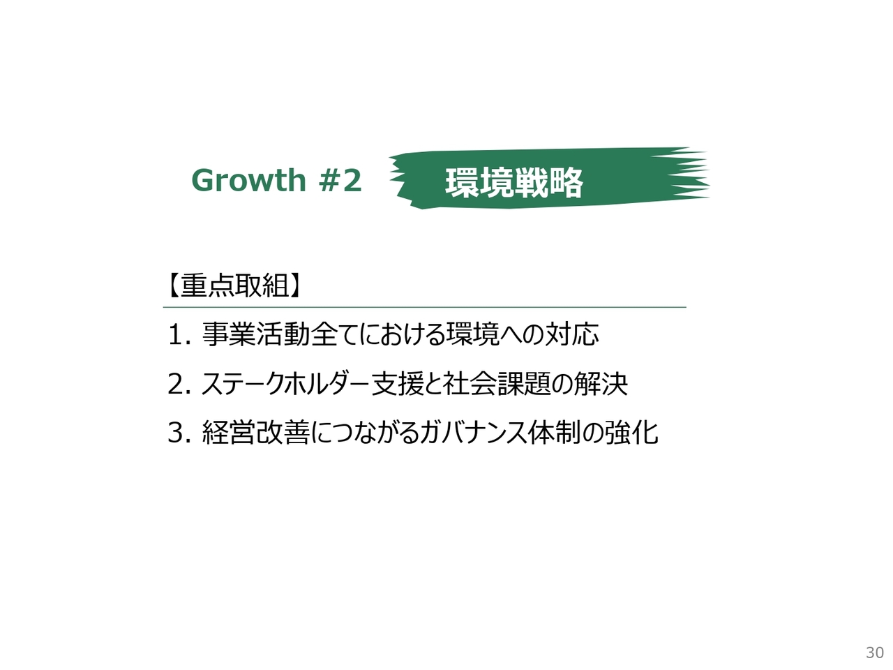 荒賀:Growth#2の環境戦略としては、スライドに記載の3つの重点取組を進めていきたいと考えています。