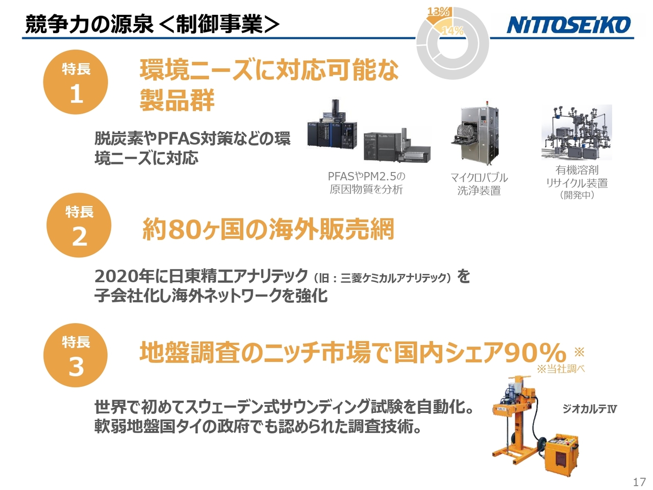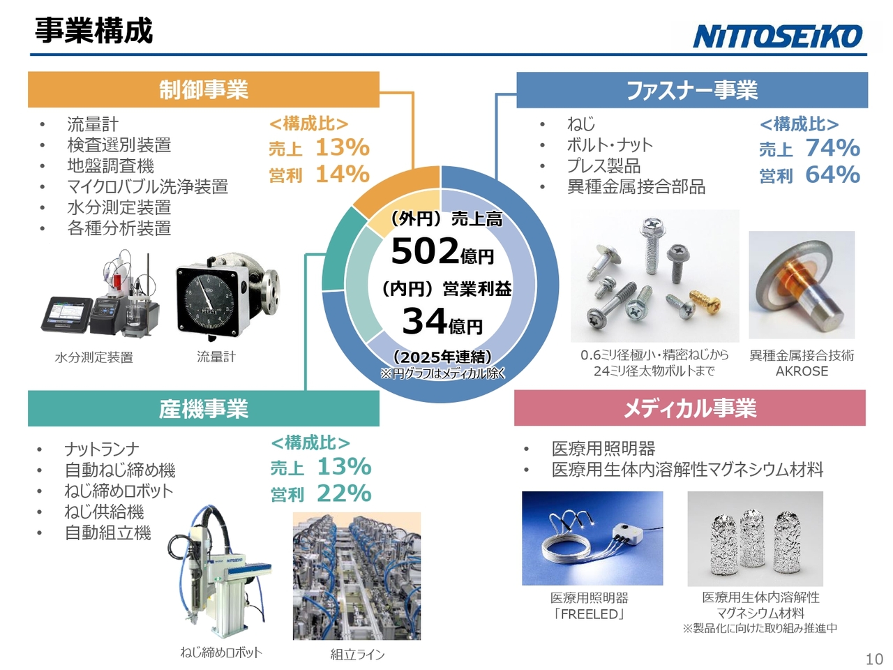 また、ねじ締め機や自動組立機を扱う産機事業と、計測・検査・分析機器を中心とした制御事業を合計して、売上高の約3割を占めています。メディカル事業は新規事業であり、現在、製品化に向けた取り組みを進めている段階です。