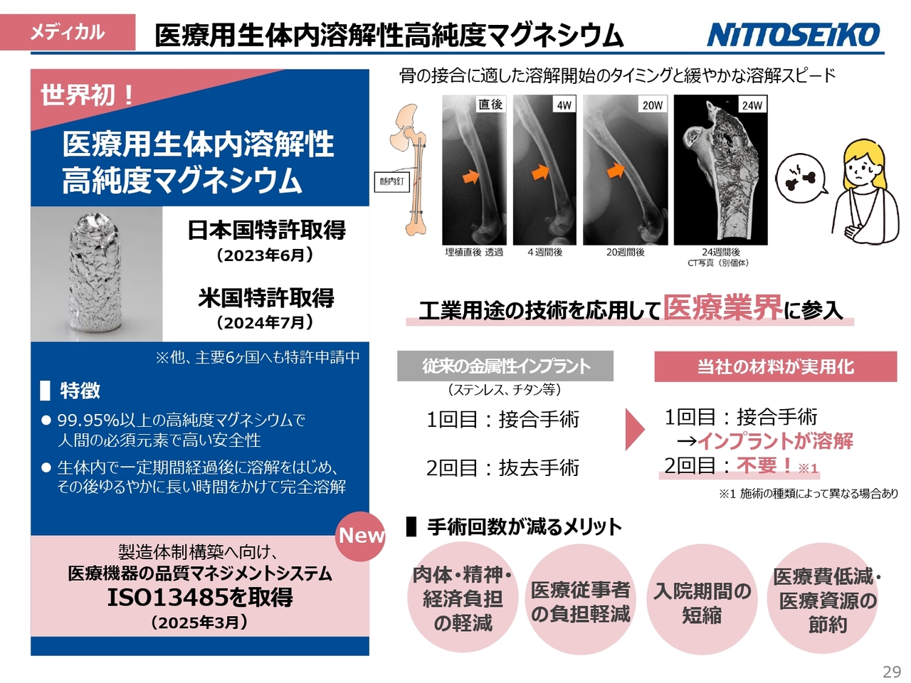 荒賀:メディカル事業です。医療用生体内溶解性高純度マグネシウムの開発についてです。本素材は、世界初の新素材であり、高い安全性を誇るとともに、生体内で溶解する特徴を持ち、日米で特許を取得しました。