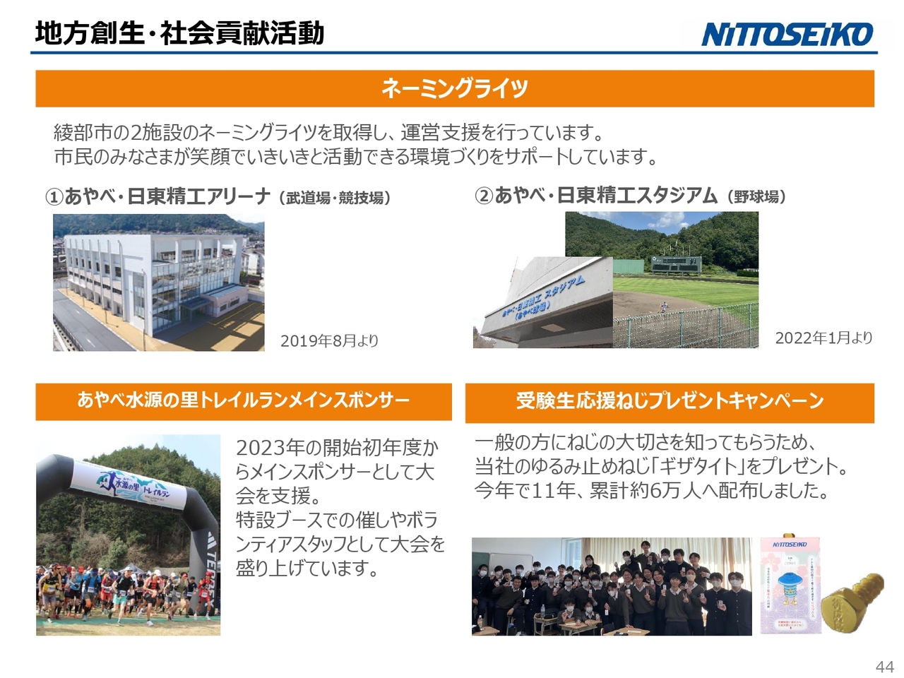 荒賀:地方創生・社会貢献活動についてです。綾部市内の2施設でネーミングライツを取得し、運営支援を行っています。