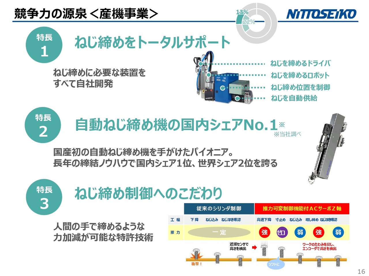 この強みを活かし、ねじを知っているからこそねじ締めドライバの開発に活かせる、ねじ締めドライバを作るからこそねじの開発に活かせる、ということで、産機事業を成長させたいと考えています。