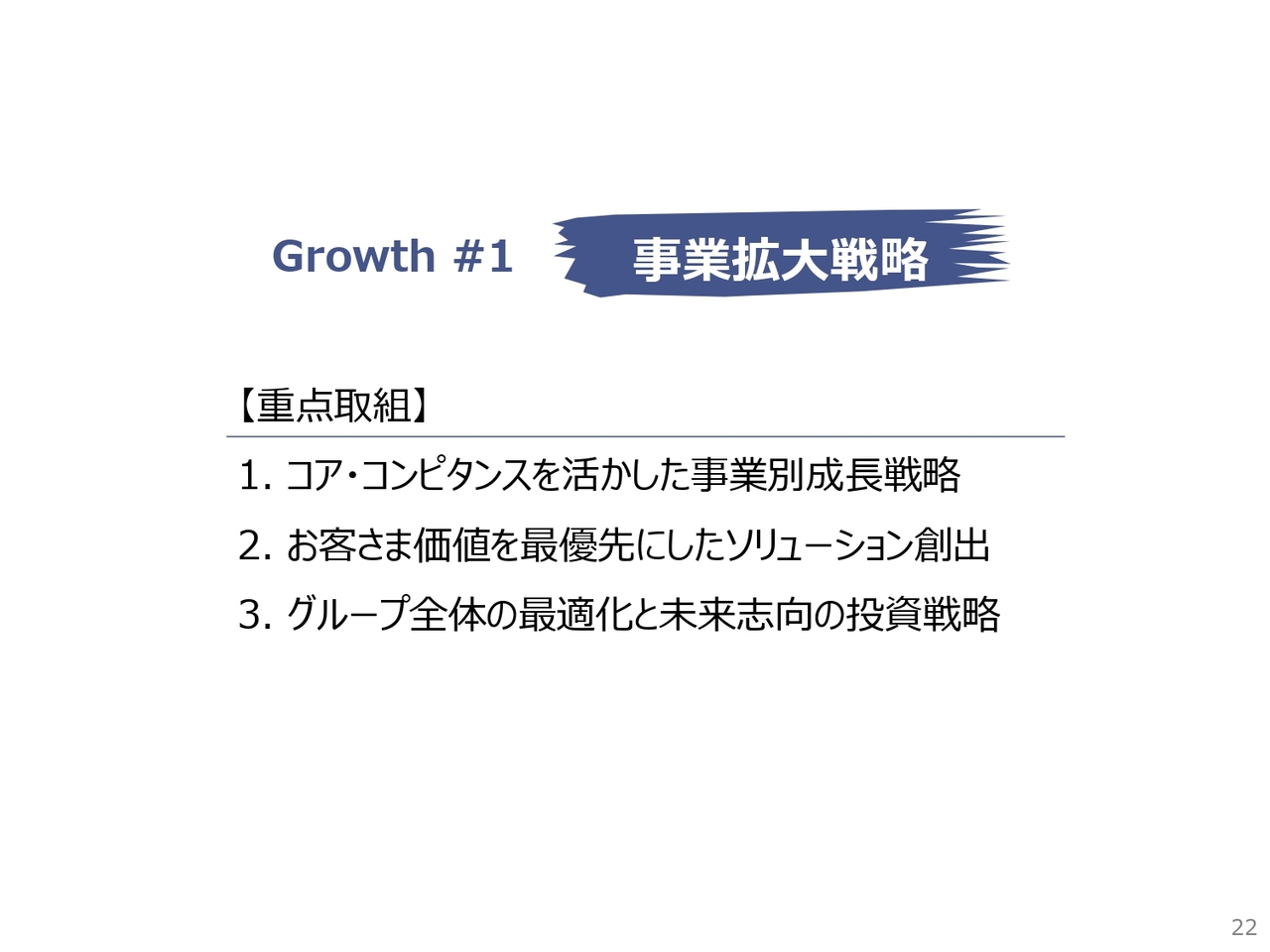 荒賀:Growth#1の事業拡大戦略としては、スライドに記載の3つの重点取組を進めていきたいと考えています。