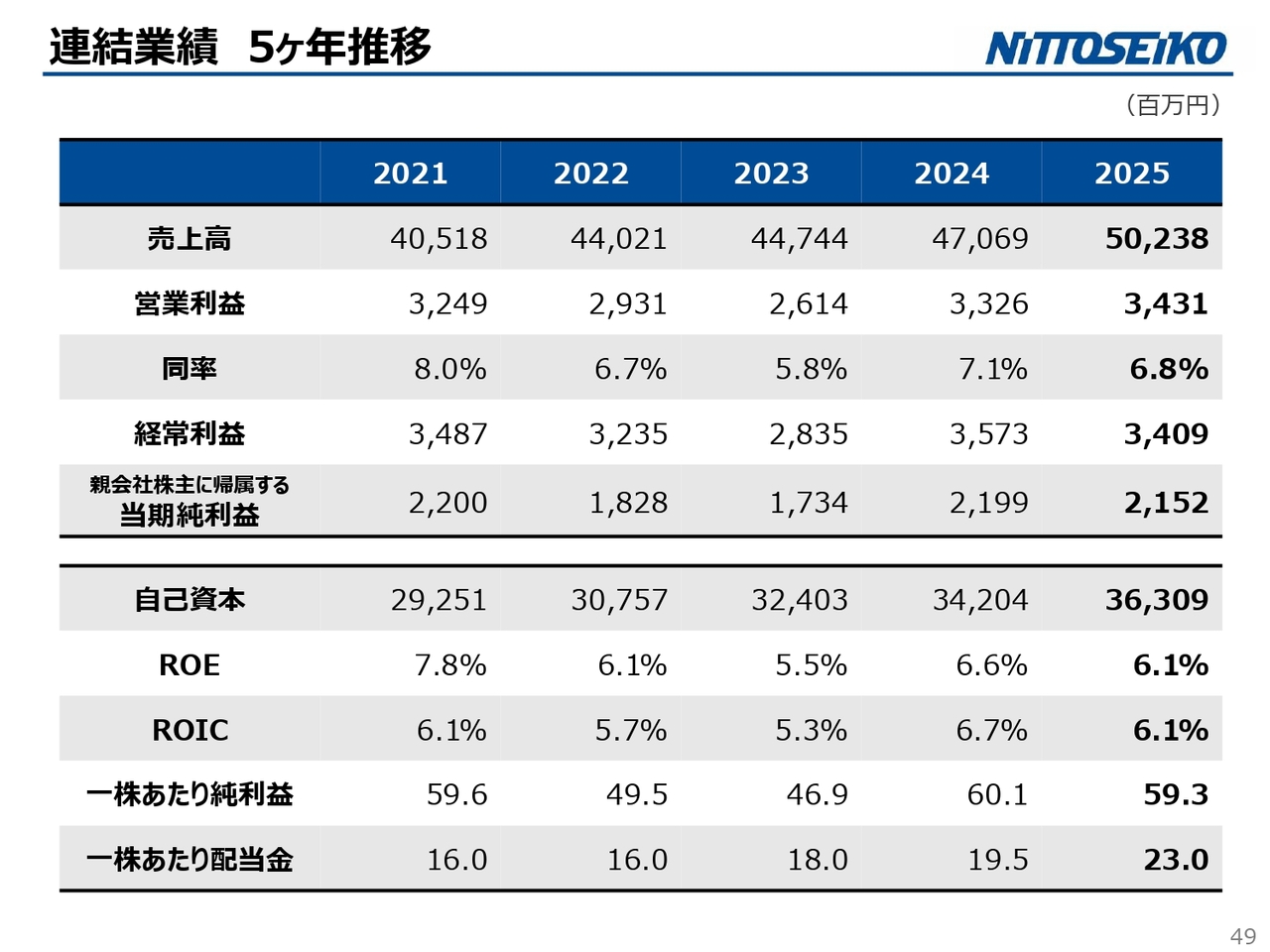 荒賀:スライドは、連結業績5年間の推移です。昨年は過去最高の売上高を達成しました。営業利益はリーマン・ショック以降の最高益を確保しています。