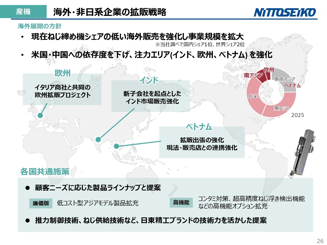 また、中国やアメリカへの依存度が高い傾向があります。そのため、今後の戦略としては、シェアの低い地域への海外販売を強化し、特に注力エリアであるインド、欧州、ベトナムへの拡販を進めていきたいと考えています。