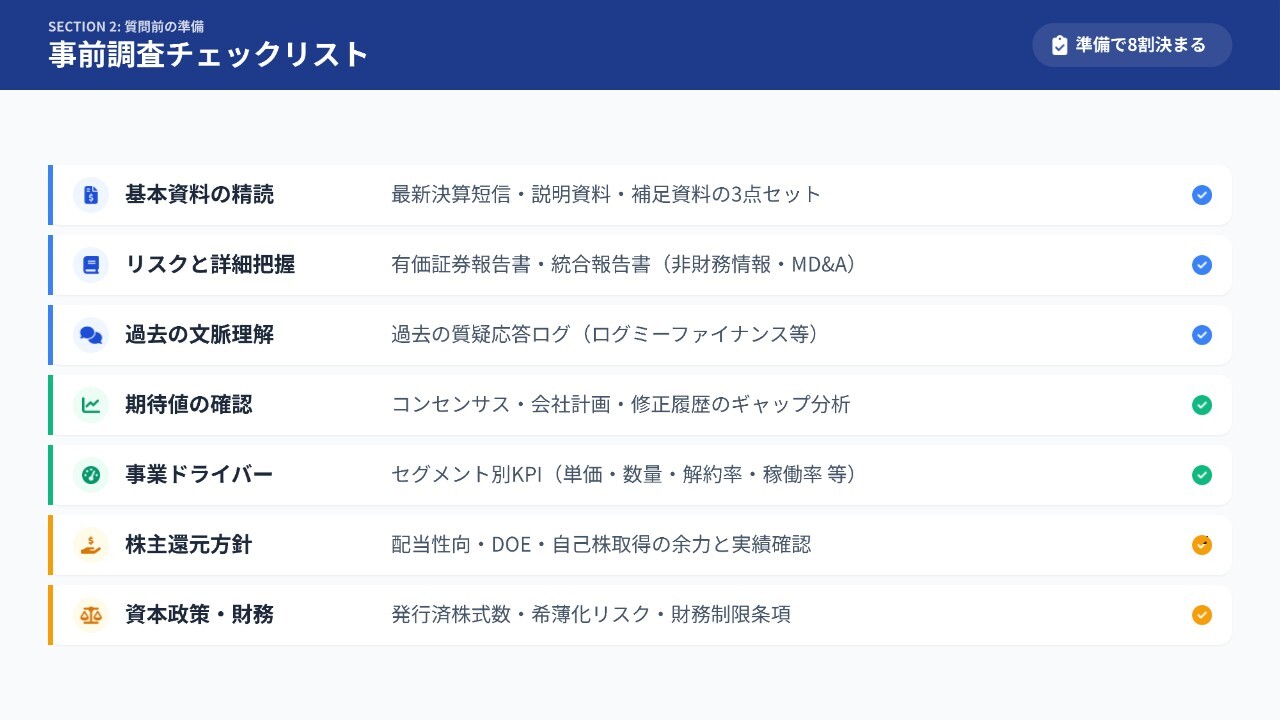 それでは具体的な内容に入っていきます。「質問前の準備編」のポイントは、冒頭でも触れましたが、「聞く前に勝負の8割は決まっている」ということです。
