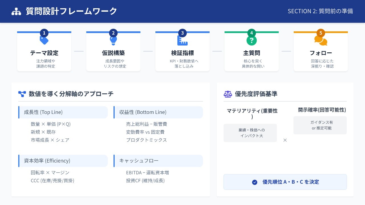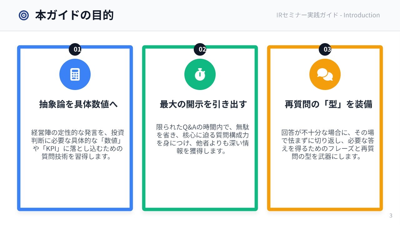 2点目が「最大の開示を引き出す」ことです。限られたQ&Aの時間の中で、無駄を省き、核心に迫る質問をすることで、より深い情報を得ることができます。