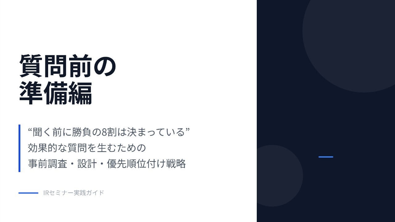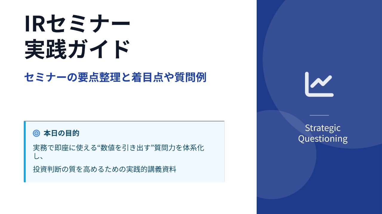 また、IRセミナーや株主総会での質問に限らず、勉強会などの自由な形式で質問できる場面でも役立てられるようなポイントにも触れたいと思っています。