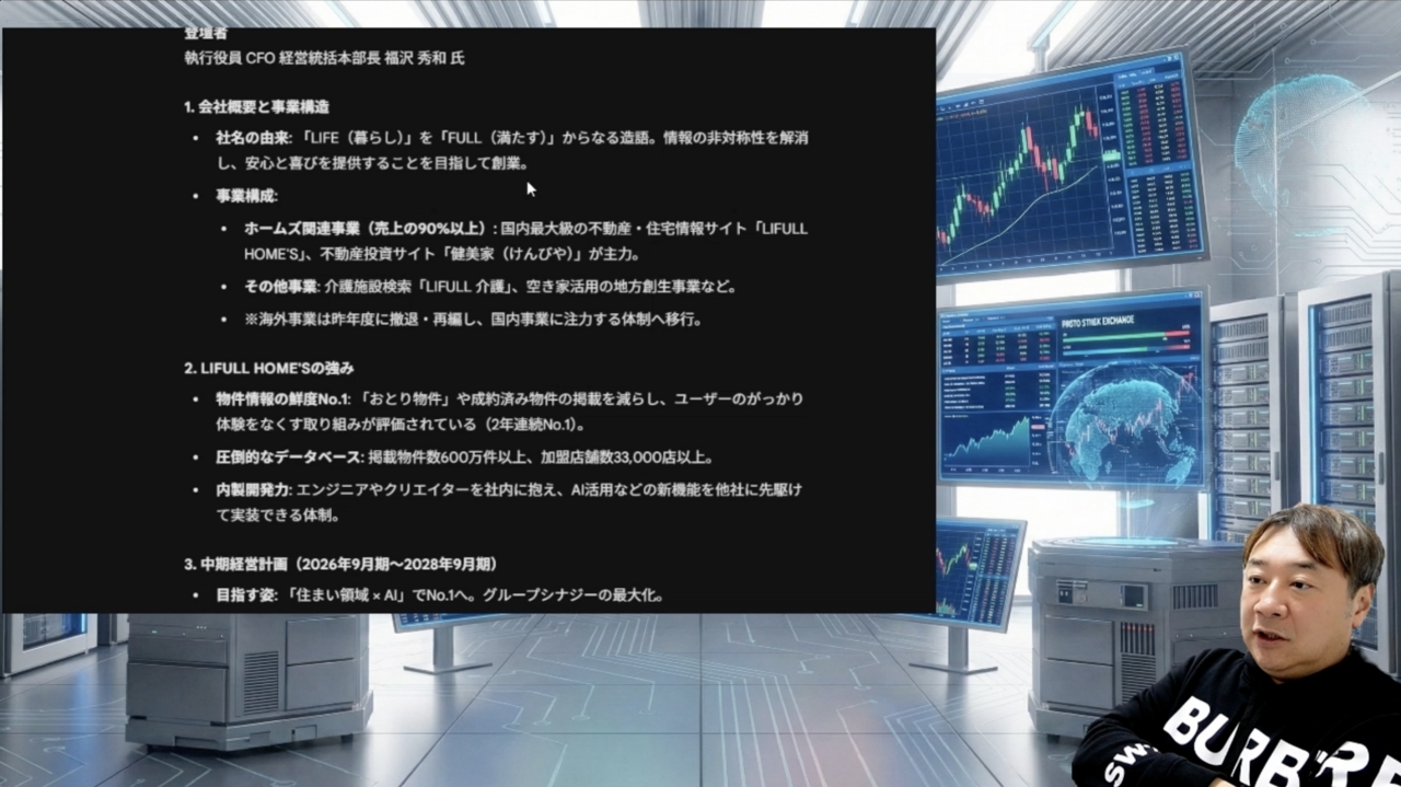 要約では、国内最大級の不動産住宅情報サイト「LIFULL HOME'S」や「健美家」のほか、介護事業が加わったことなど、事業内容が非常にわかりやすくまとめられています。