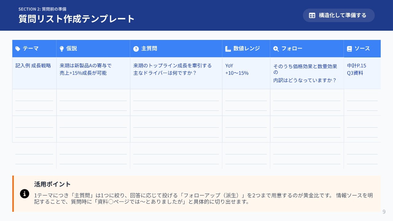 こちらのスライドには質問のテンプレートを用意しました。ご自身で埋めてみることで、「ログミーFinance」のようなIRセミナーでも良い質問ができるのではないかと思います。
