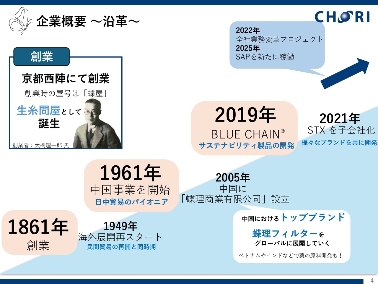 蝶理は、1861年の創業以来、160年を超える歴史を歩んできました。1961年に日中貿易のパイオニアとして中国に進出して以来、中国との信頼関係を活かし、半世紀以上にわたり独自のサプライチェーンガバナンスを確立しています。