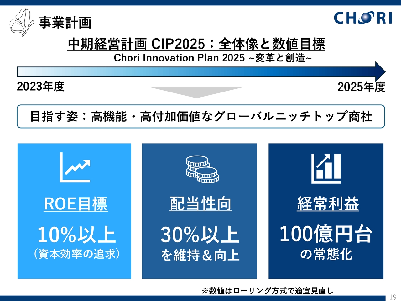 事業計画についてです。中期経営計画「Chori Innovation Plan 2025」の達成に向け、蝶理独自のフィルター機能をさらに強化してきました。