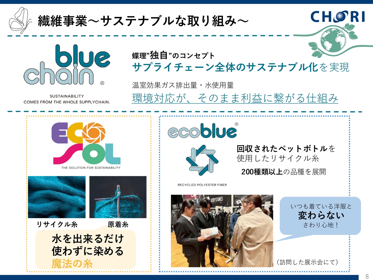 製造現場への深い介入を通じ、日本基準を徹底させる指導力が、現在の蝶理品質の礎となっています。現在はこの管理能力を環境分野にも展開しており、2019年からは独自のコンセプト「BLUE CHAIN(ブルーチェーン)」を掲げ、環境配慮型ビジネスの加速にも取り組んでいます。