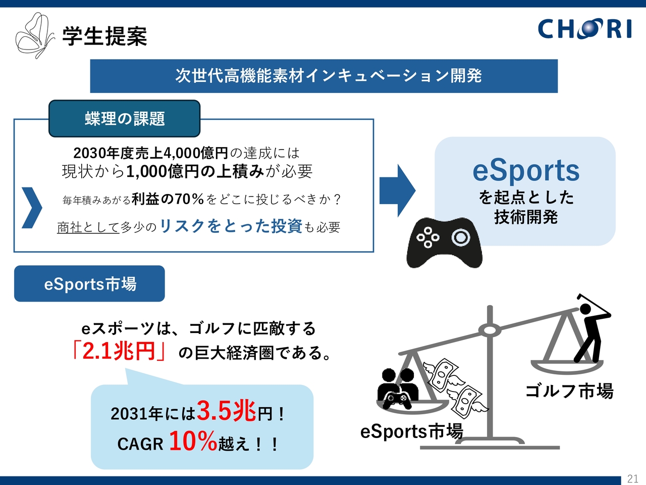 そこで私たちは、既存事業の延長ではなく、まったく新しい領域への投資として、eSportsを起点とした次世代高機能素材の開発を提案します。