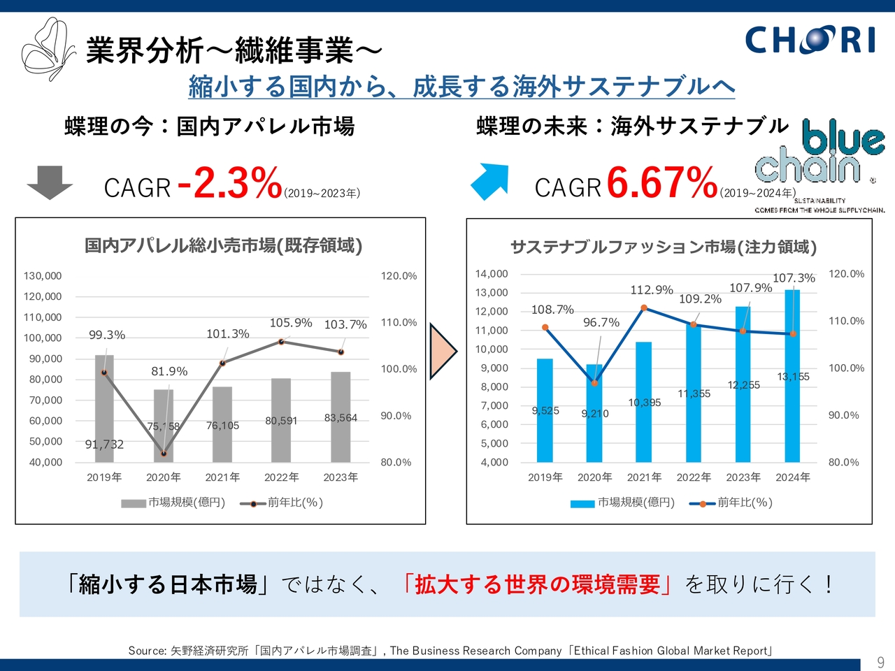 実際、国内のアパレル市場は少子高齢化の影響を受け、縮小傾向にあります。一方、世界のサステナブルファッション市場は年々拡大しています。蝶理は拡大する世界の環境需要を次のブルーオーシャンと位置づけ、グローバル市場でのシェア拡大を目指します。