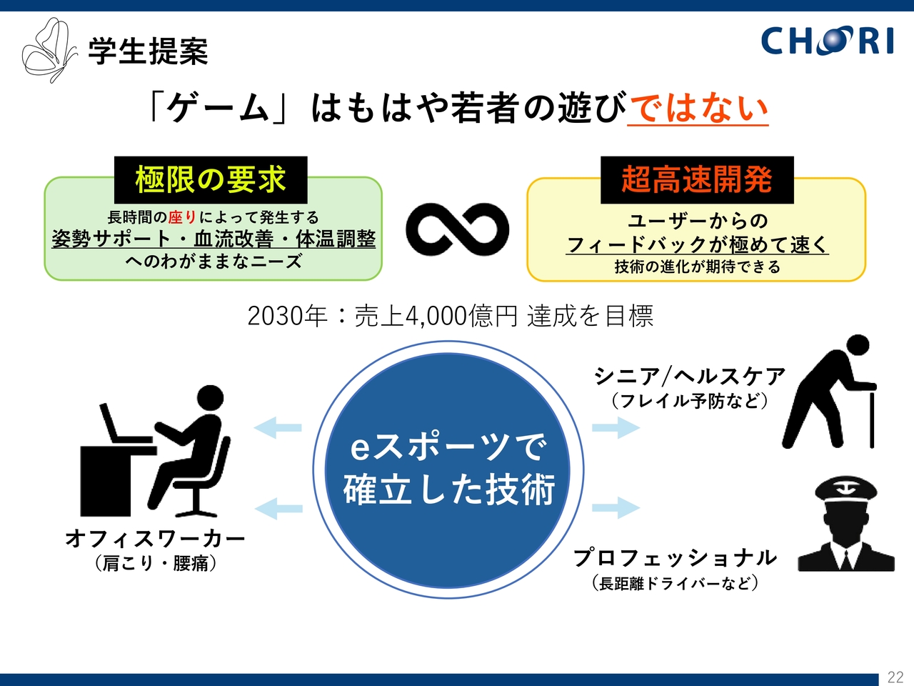 メインターゲットは、身体負荷が非常に高い職業であるプロゲーマーです。彼らの平均座位時間は10時間以上に及び、世界最長の座位時間を持つ日本人の平均である7時間を大きく上回っています。