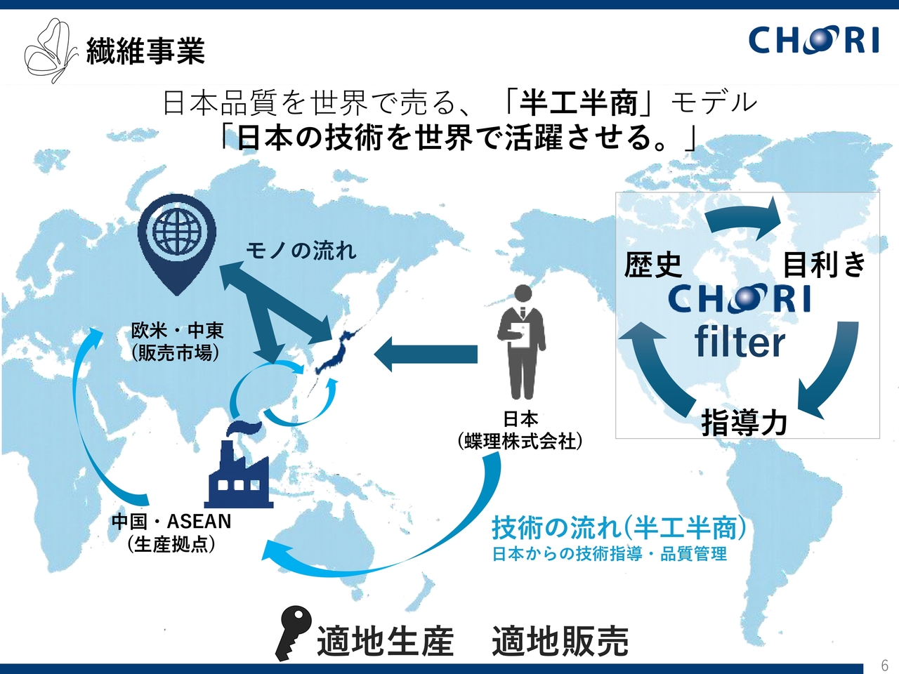 蝶理の最大の強みは、単なる商社としての仲介にとどまらない、「半工半商」という独自のビジネスモデルにあります。自社工場を持たずとも、製造現場に深く入り込み技術指導を行う「蝶理フィルター」を機能させることで、日本品質の製品を世界中の拠点から供給できる体制を整えています。