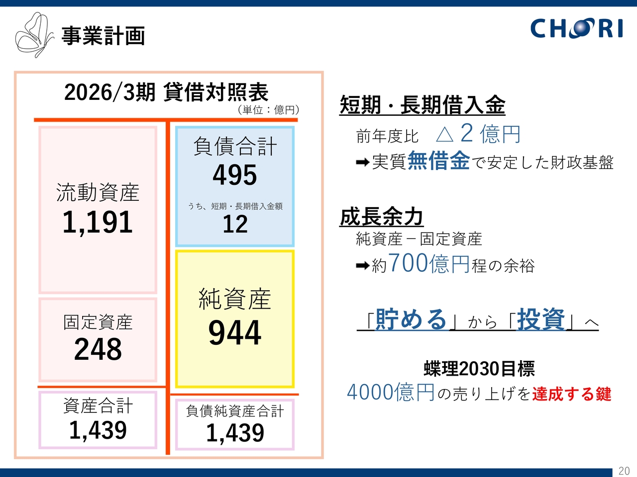 2026年3月期の連結貸借対照表です。特筆すべき点は、有利子負債がわずか12億円と、前年比でさらに減少していることです。これは、蝶理が実質無借金という、極めて強固な財政基盤を有していることを示しています。また、純資産から固定資産を差し引いた成長余力は約700億円に上り、M&Aや新規事業に投じるための潤沢なキャッシュがすでに確保できていることを示しています。