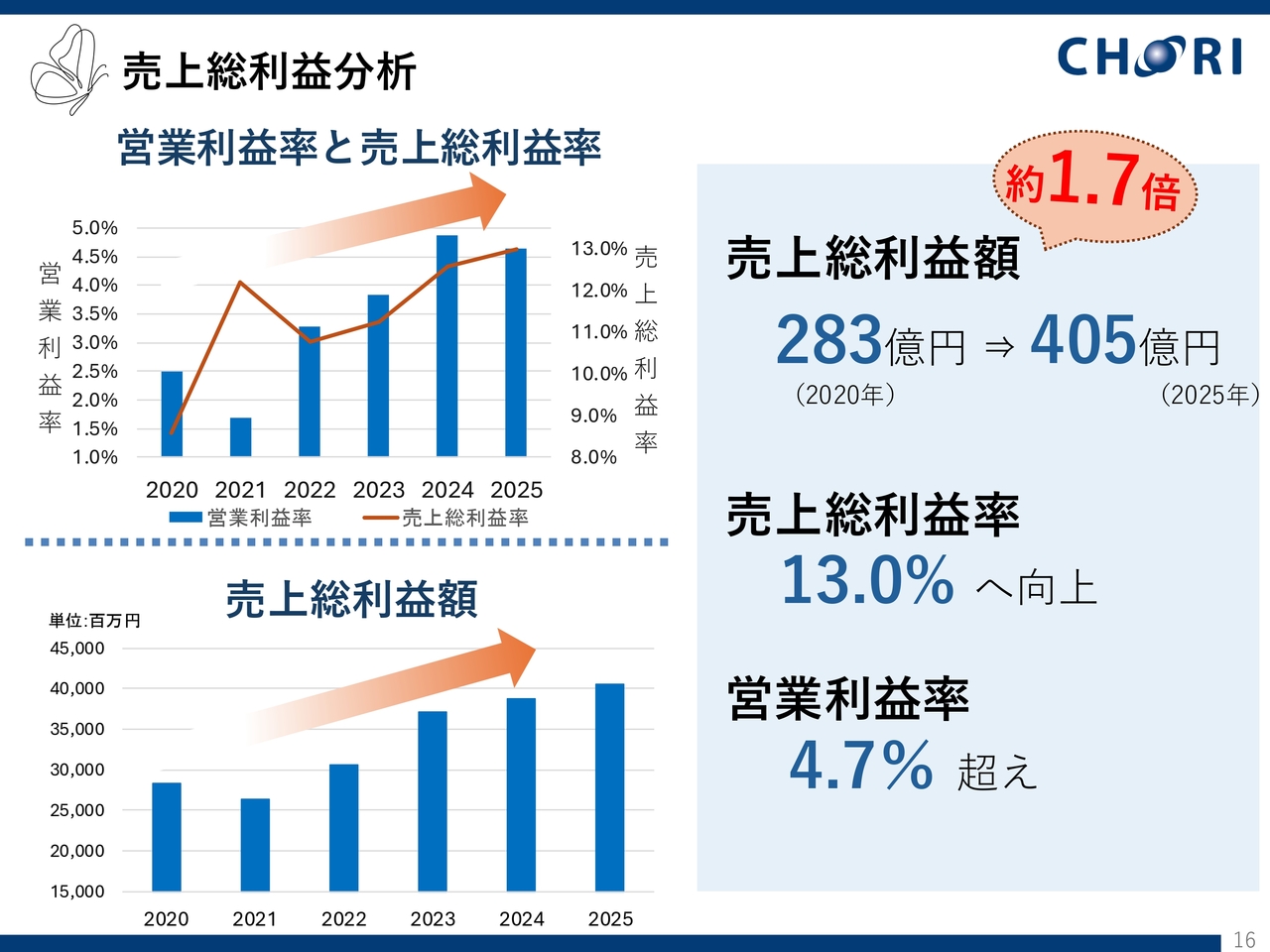 蝶理の高付加価値化戦略の成果についてです。スライドのグラフは、売上規模だけでなく、売上の質がどのように向上したかを示しています。左上のグラフにあるとおり、利益率は右肩上がりで推移しており、売上総利益額は5年間で約1.7倍と大幅に拡大しました。また、売上総利益率も13パーセントまで向上しています。