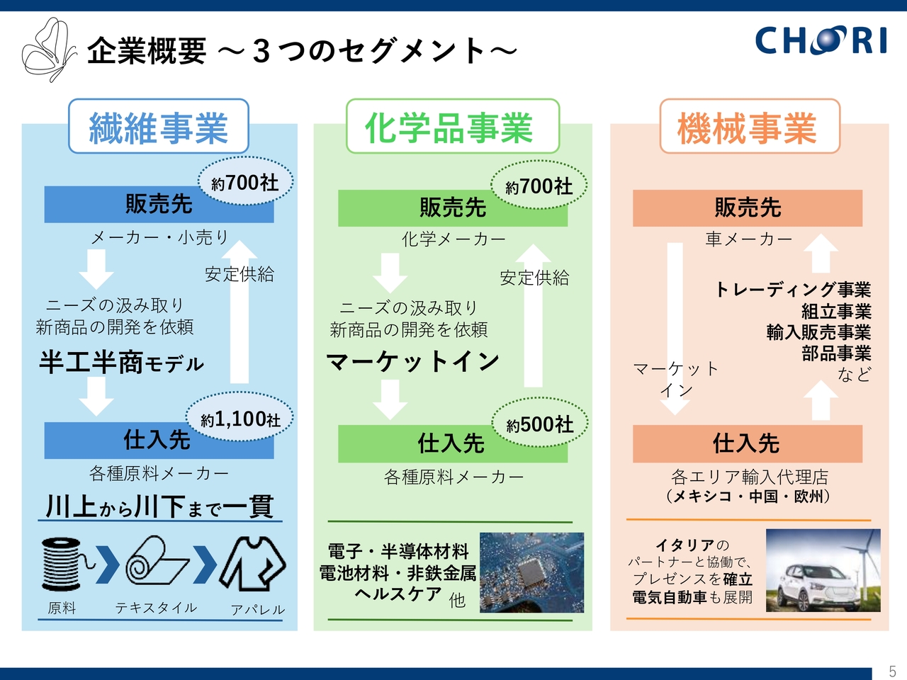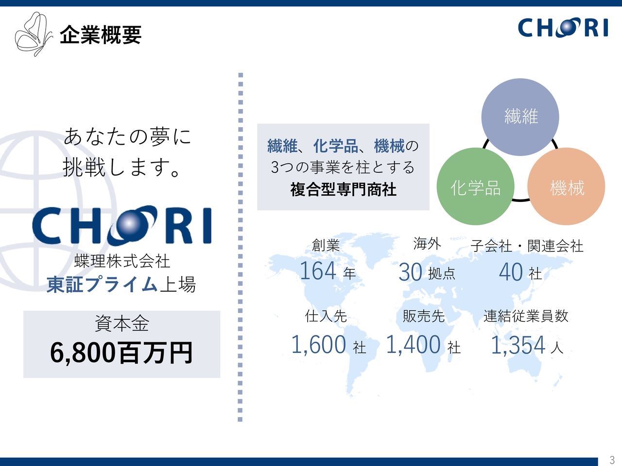 蝶理は東証プライムに上場しており、繊維、化学品、機械の3つの事業を柱に、高機能・高付加価値を追求する複合型専門商社です。
