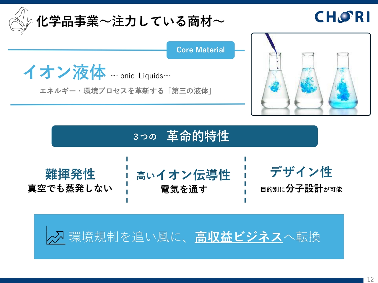 その核となるのが、次世代素材であるイオン液体です。これは、真空でも蒸発せず、電気を通し、自在に分子設計ができるという3つの革命的な特性を持ち、安全な二次電池やCO2回収など、地球規模の課題解決を可能にします。