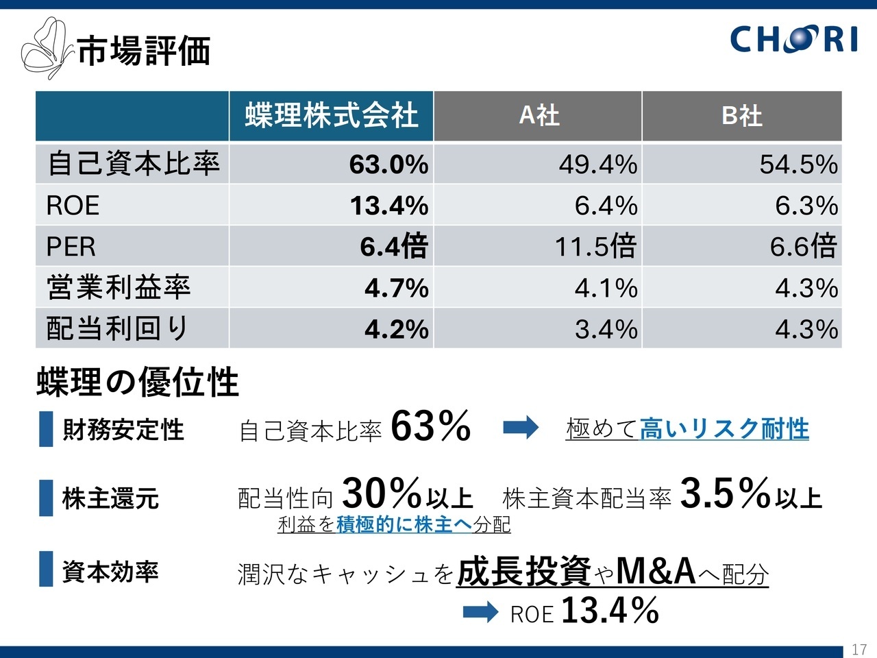 ご覧のとおり、蝶理は自己資本比率が63パーセントと他社を大きく上回り、非常に高い財務安定性を有しています。また、キャッシュを蓄えるだけでなく、配当性向30パーセント以上の株主還元を行いつつ、成長投資やM&Aも進めています。