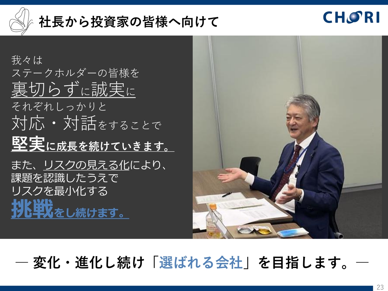 スライドは、蝶理の迫田社長から、個人投資家のみなさまへ向けたメッセージです。