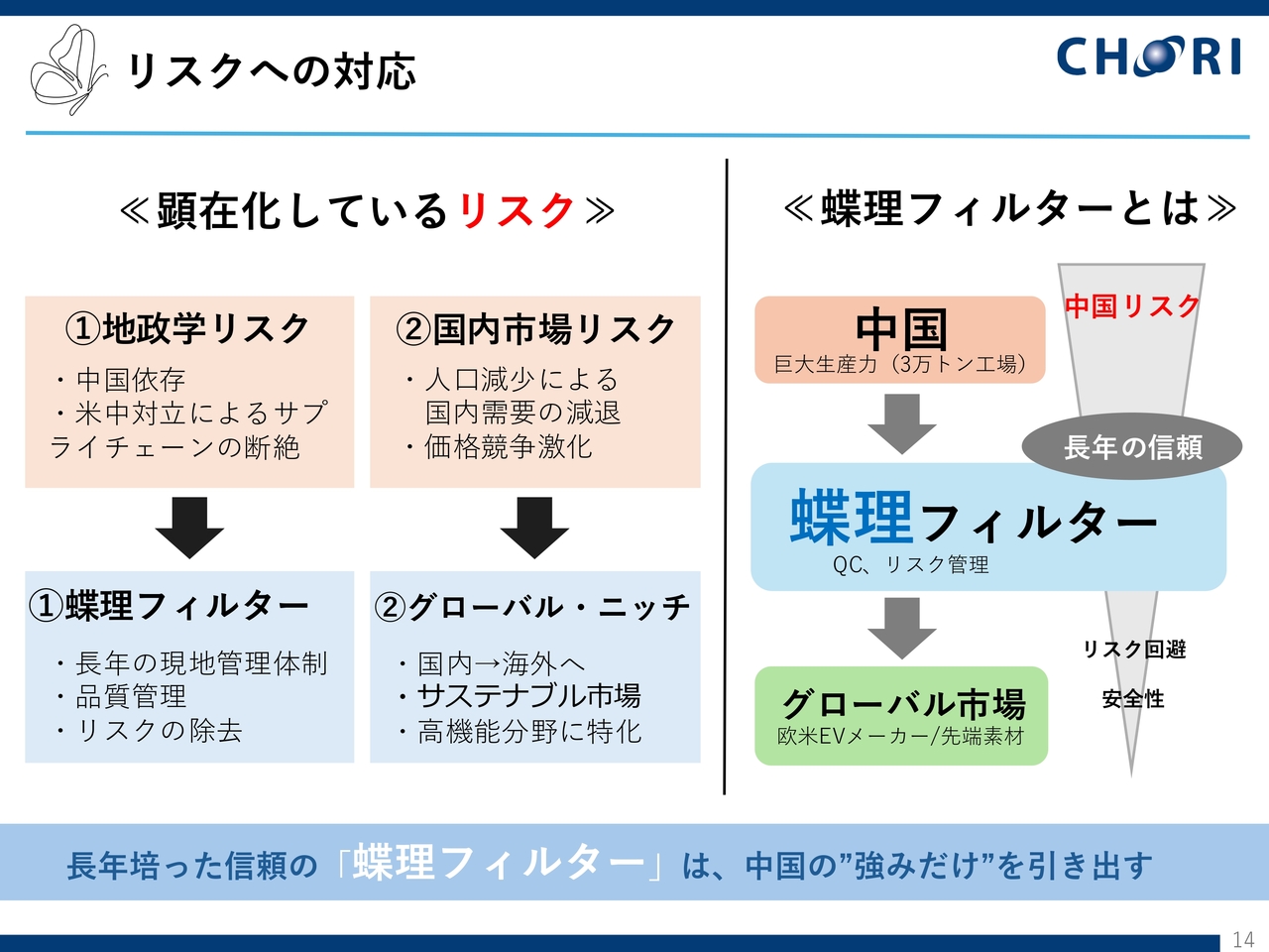 リスクについてお話しします。中国リスクへの懸念に対する蝶理の答えは明確です。リスクがあるからこそ、蝶理の介在価値を発揮できると考えています。70年をかけて構築した「蝶理フィルター」によって、地政学リスクという不純物を取り除き、製品の真の価値だけを世界へ届けます。