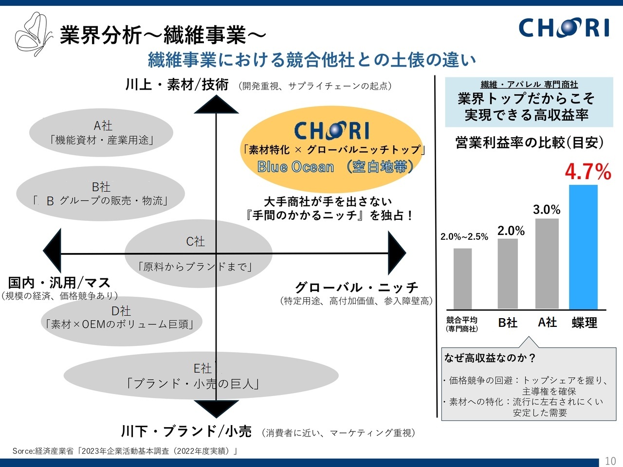 スライドのグラフをご覧ください。左側のグラフは、繊維・アパレル業界における蝶理の立ち位置を示しています。この市場における他社との最大の違いは、「素材」と「グローバルニッチ」の分野にあります。
