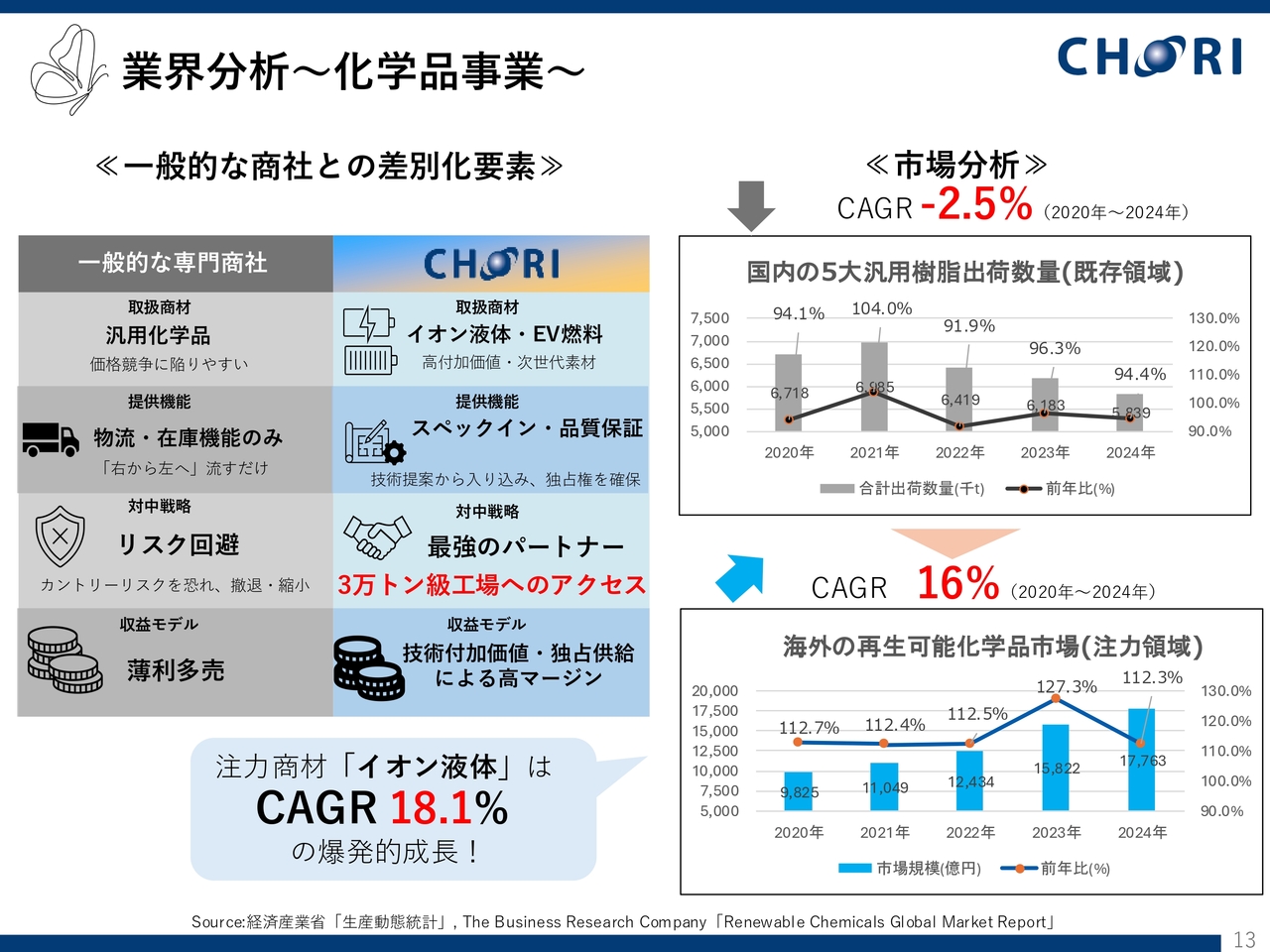 他社が撤退する市場でも、安全な商流を実現できることが蝶理の高収益の源泉です。さらに、国内需要の減退に対しても、海外のサステナブル分野でグローバル・ニッチな地位を確立しています。