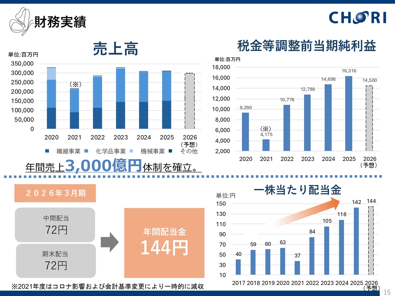 蝶理の財務実績です。蝶理は2021年3月期より会計基準を変更しており、その影響で該当年の売上高が一時的に減少しました。しかし、その後は着実に回復し、2023年3月期以降は年間売上高3,000億円規模を安定的に維持しています。これは、蝶理独自の「半工半商」ビジネスモデルと高付加価値分野への注力により、収益力が強化されたためです。