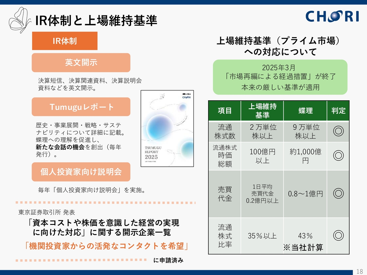 村上俠太朗氏:続いて、IR体制についてご説明します。蝶理は、英文開示や個人投資家向け説明会の拡充などを通じて、透明性の高い対話を心がけています。東証の「資本コストや株価を意識した経営の実現に向けた対応」についても、機関投資家との活発な対話を希望する企業として申請しています。