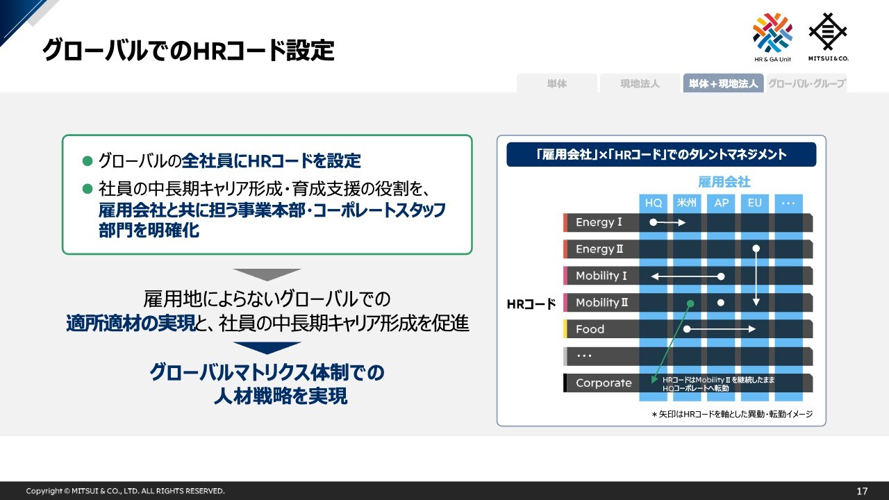 このグローバルマトリクス体制での人材育成や各取組みを実現するために、世界中の全社員にHRコードを設定しています。