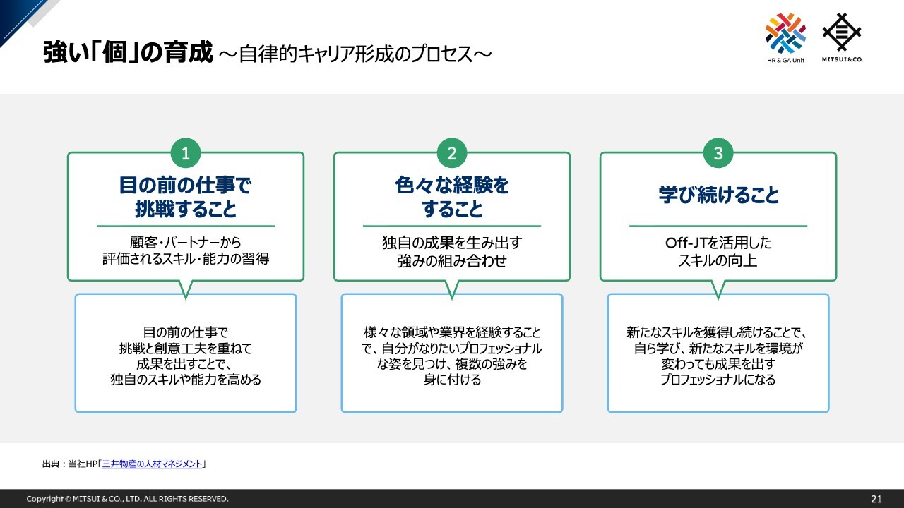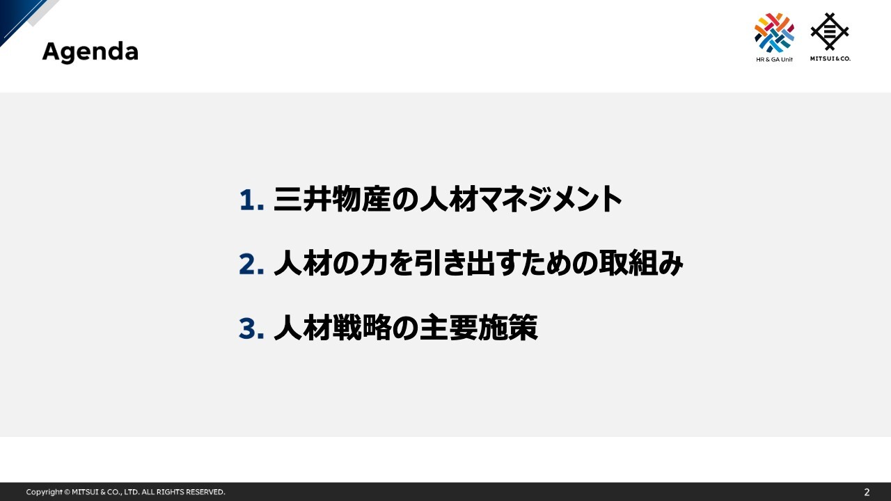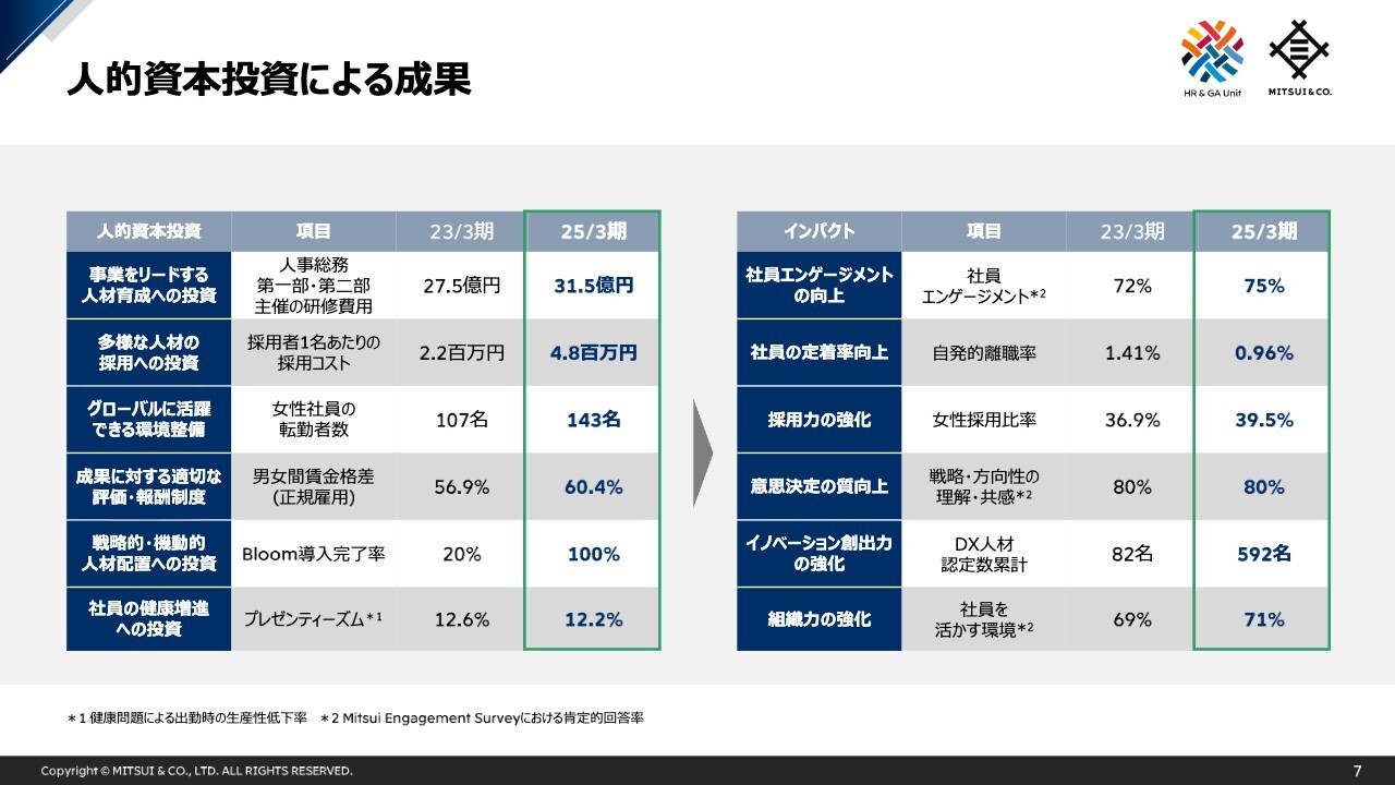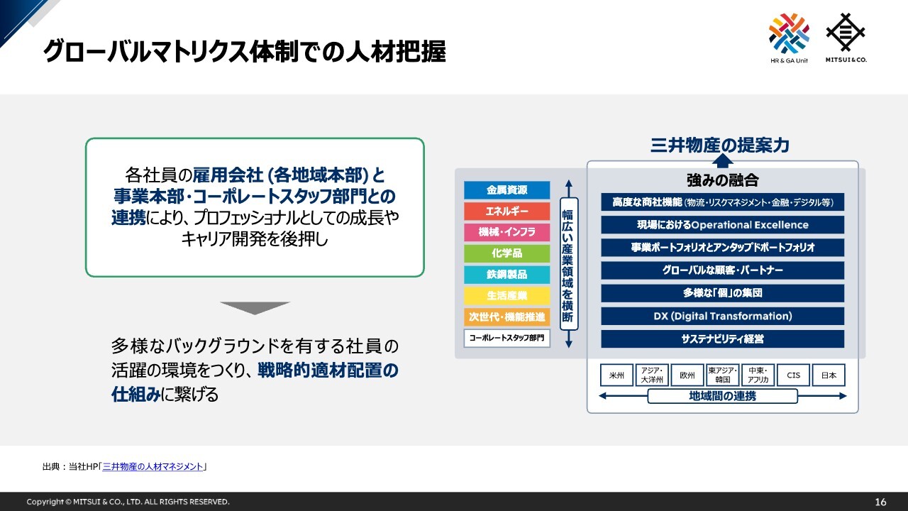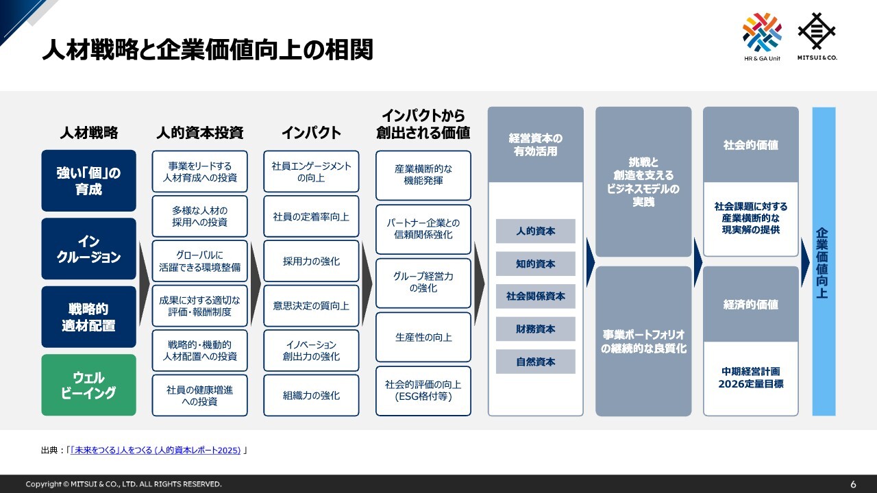 私からのご説明は以上となりますが、三井物産では、人的資本を持続的な価値創造の源泉と位置付け、人材戦略に基づく取組み・投資を継続しています。
