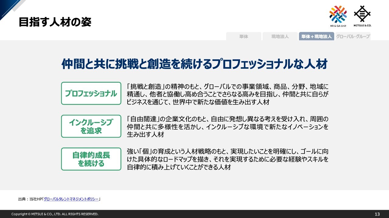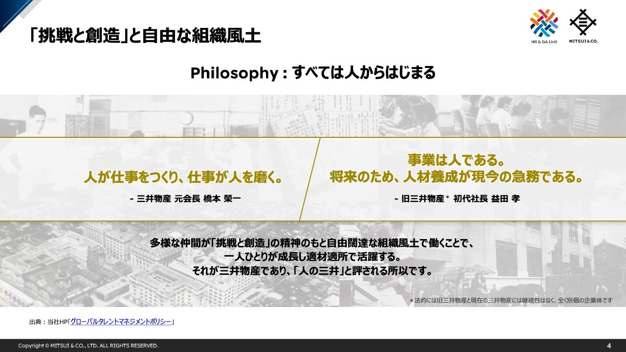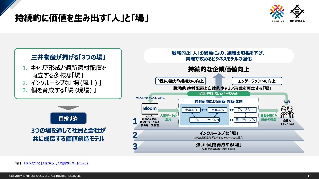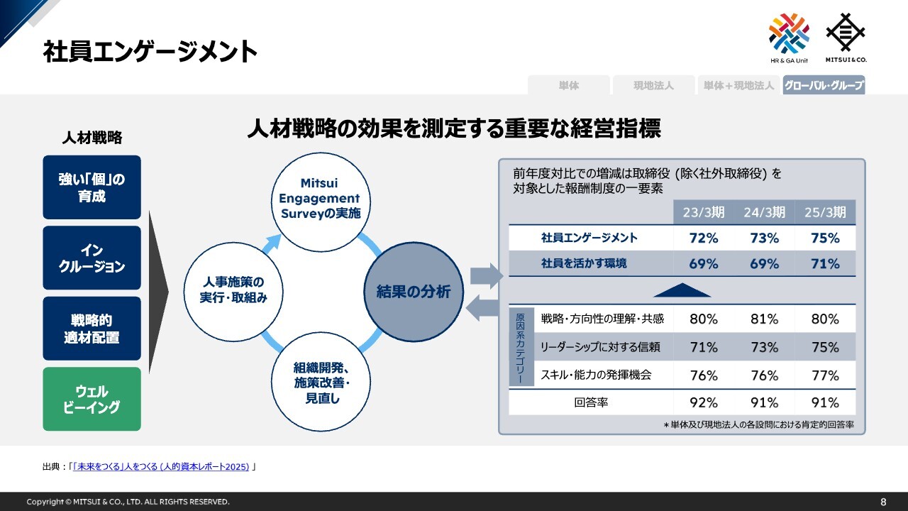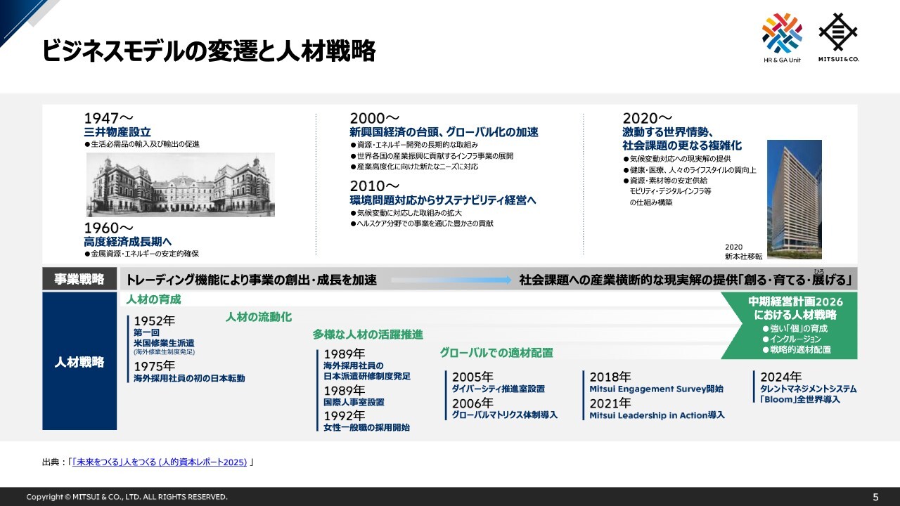 私からのご説明は以上となりますが、三井物産では、人的資本を持続的な価値創造の源泉と位置付け、人材戦略に基づく取組み・投資を継続しています。