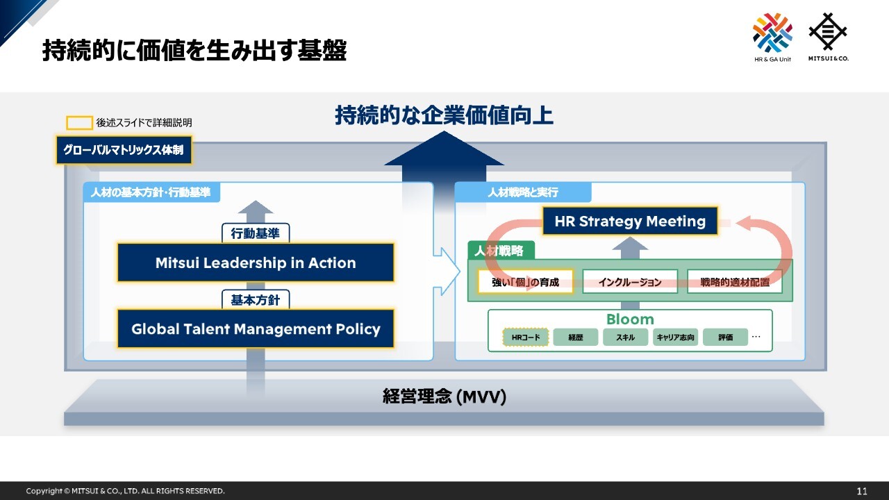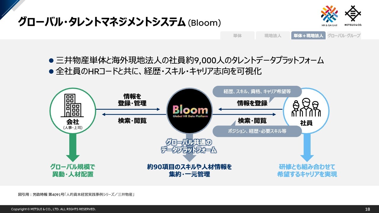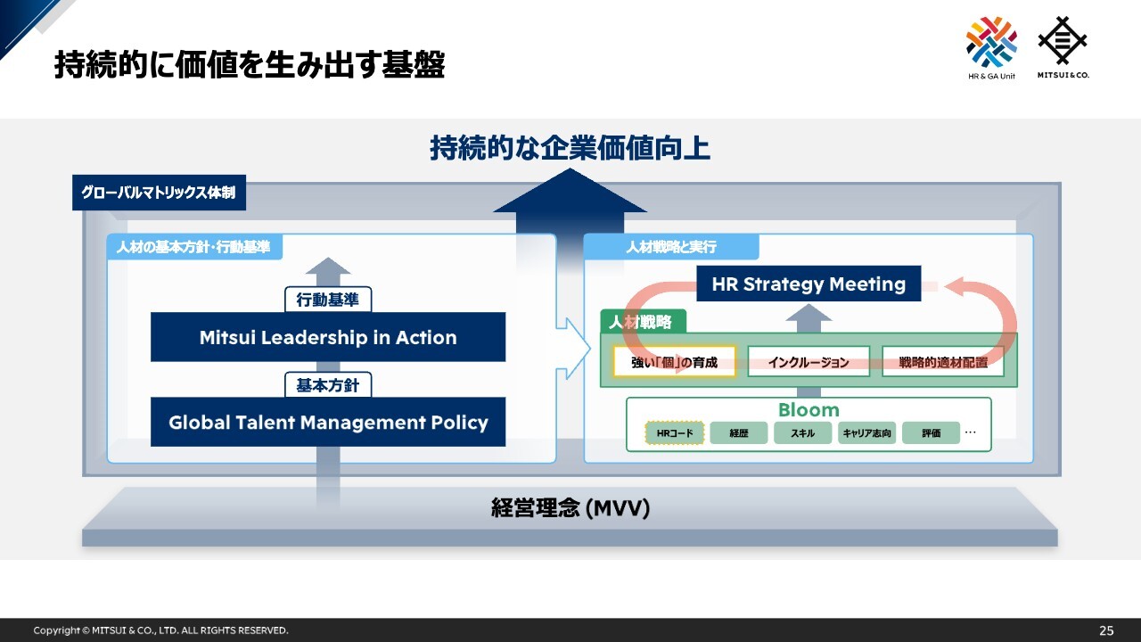 当社はMissionとして「世界中の未来をつくる」を掲げており、実現するために社員と会社の双方が目指す姿を示したGlobal Talent Management Policyと、それを実現するための行動基準がMitsui Leadership in Actionです。この2つを基本とした人材戦略を、グローバルタレントマネジメントプラットフォームであるBloomの人材データを活用しながら実現します。