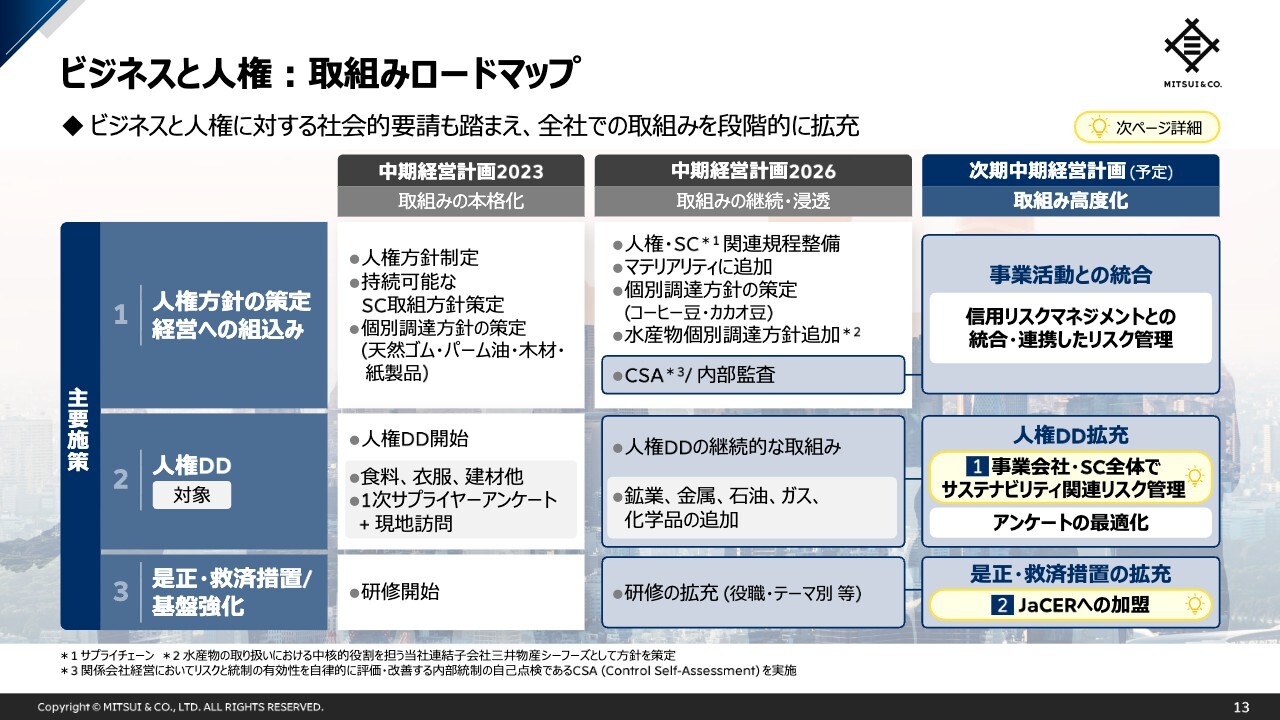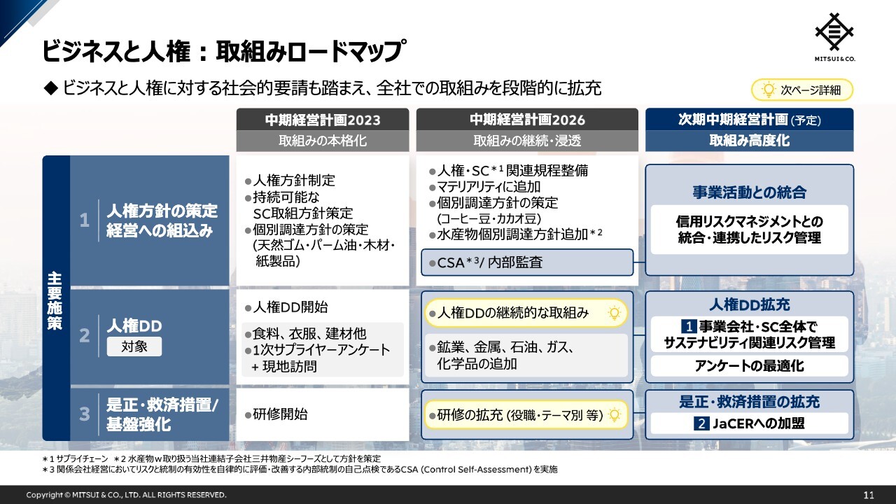 2つ目のポイントは「人権デューデリジェンスの拡充」です。人権デューデリジェンスの対象を主要サプライヤーに留めず、事業会社やサプライチェーン全体に拡大すると共に、人権に関するリスクへの対応が事業運営上不可欠であるとの認識をグループ全体で共有し、より強固なリスク管理体制の構築を目指していきます。