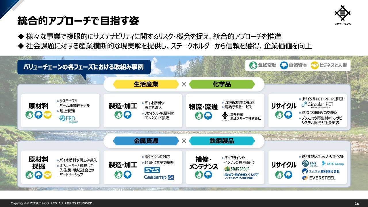 当社は、さまざまな事業において複眼的にサステナビリティに関するリスクや機会を捉え、統合的アプローチを推進しています。本アプローチをバリューチェーンの各フェーズ、例えば原材料調達から、製造・加工、物流・流通、リサイクル等の段階に織り込み、パートナーやお客さまと連携していくこと、これこそがまさに三井物産らしい取組みであると考えています。
