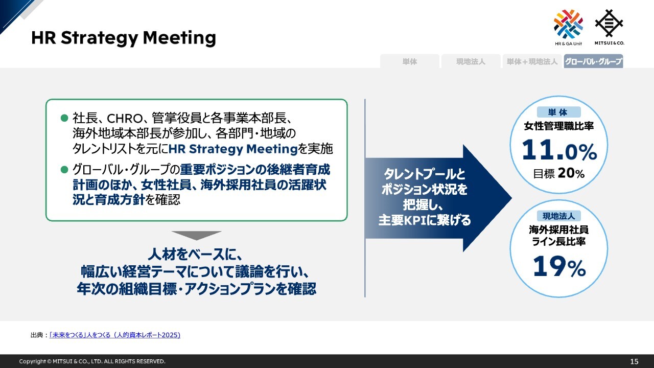 戦略的適材配置の実践として、先ほどお伝えしたHR Strategy Meetingを毎年開催し、三井物産グループの多様で幅広い人材の把握と共に、重要なポジションについては、求められるスキル・能力などを勘案した、後継者育成のプランニングを行っています。