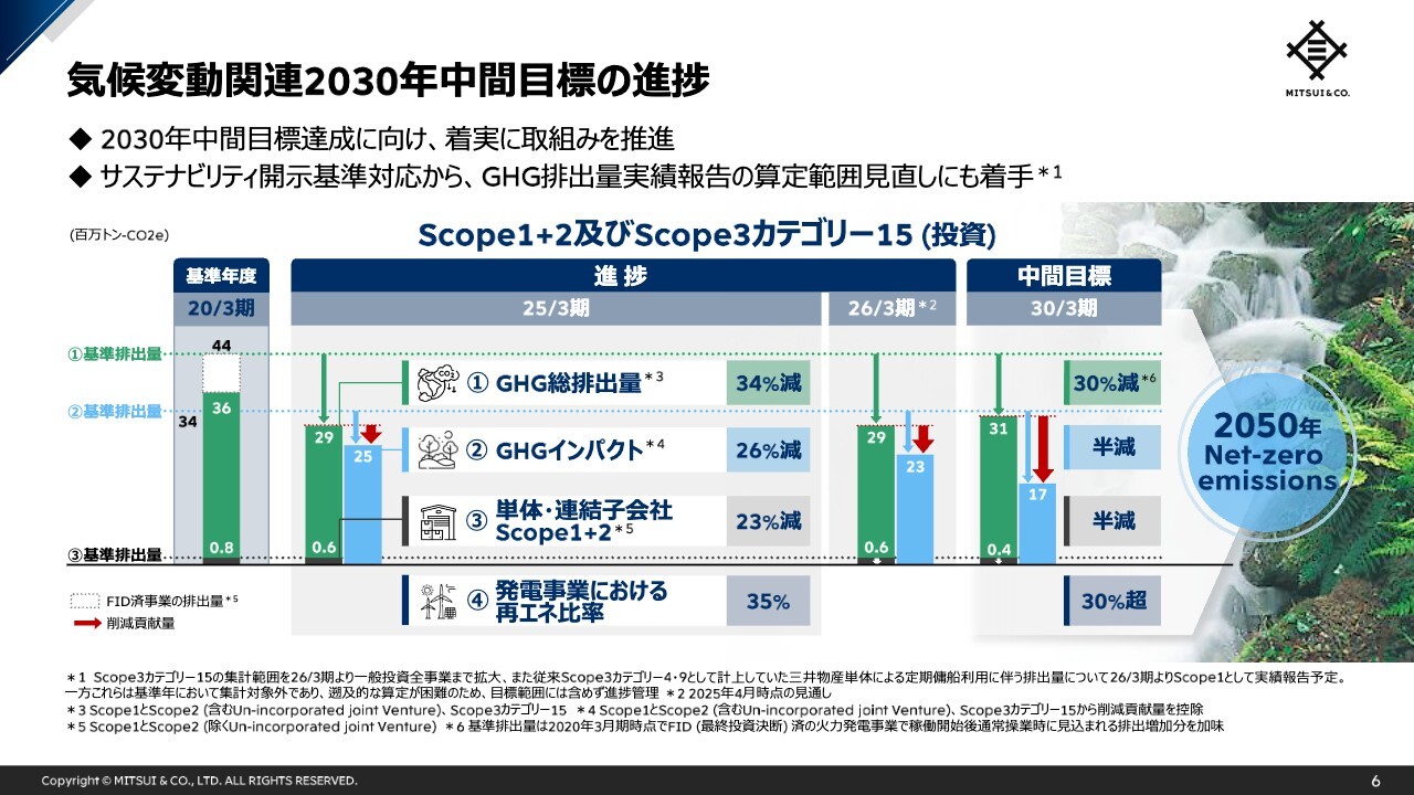 なお、当社は撤退・売却に加え新規投資も含めたアセットの入れ替えを反映し、中間目標までのトラッキングを行っています。GHG総排出量と再エネ比率は2025年3月期時点ですでに中間目標値を達成していますが、サステナビリティを取り巻く政策動向や技術進展等の外部環境の不確実性や、次期中経での事業成長によるポートフォリオの変動を踏まえ、現行の中間目標に向けて、取組みを継続的に推進していきます。