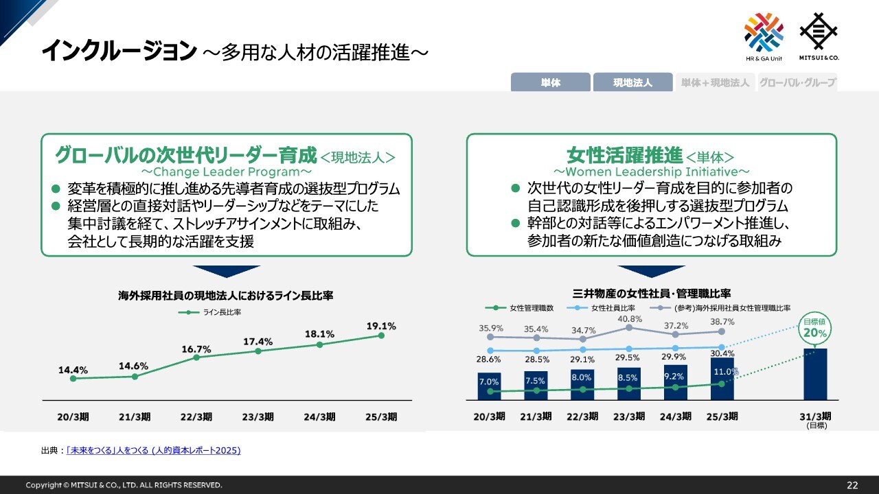 第二の柱であるインクルージョンでは、多様な人材の活躍推進のため、特に海外採用社員と三井物産単体の女性社員の活躍推進に力を入れています。