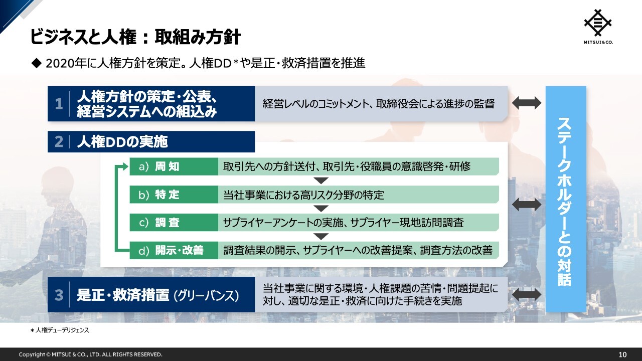 このような点も踏まえながら、本日はこれまでお示ししてきた取組みのアップデートに加え、ステークホルダーのみなさまのご関心の高まりを感じている「ビジネスと人権」や、当社が推進する「統合的アプローチ」についてご説明します。