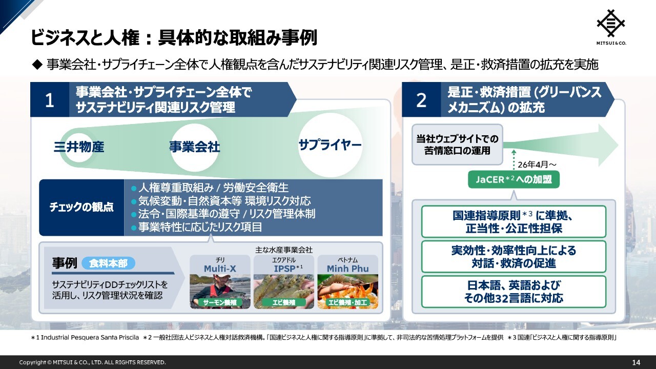 あわせて、人権問題が生じた場合に備え、「是正・救済措置の拡充」も進めています。従来の当社ウェブサイト上での苦情受付窓口に加え、2026年4月より国際指導原則に準拠したJaCERのプラットフォームへ加盟し、多言語対応を含む、より公平で実効性の高い外部の枠組みも導入します。
